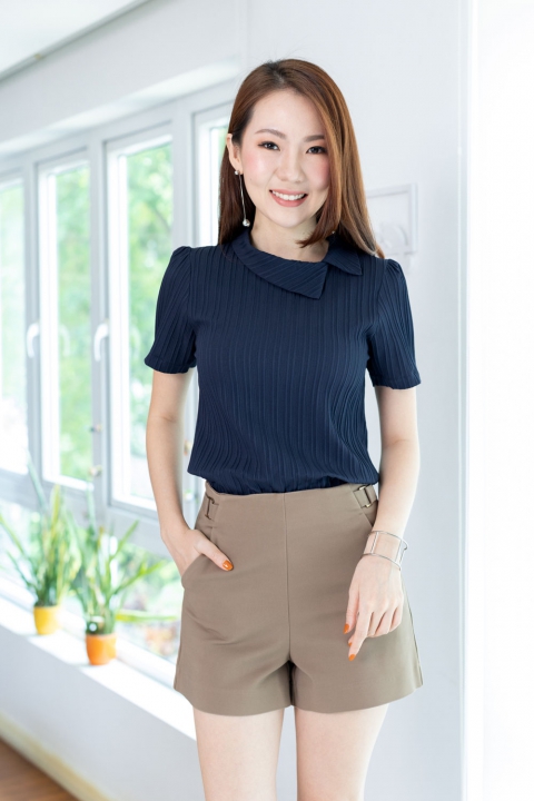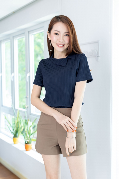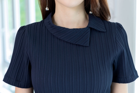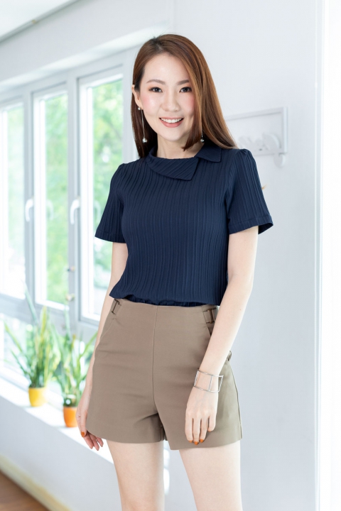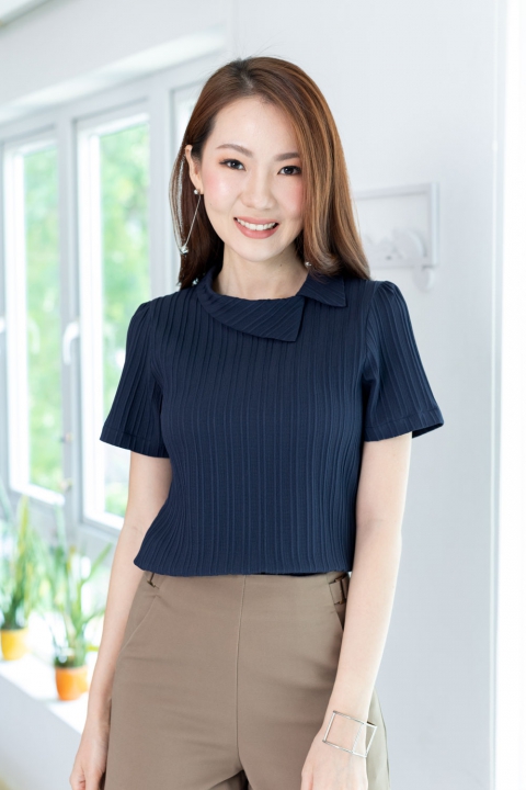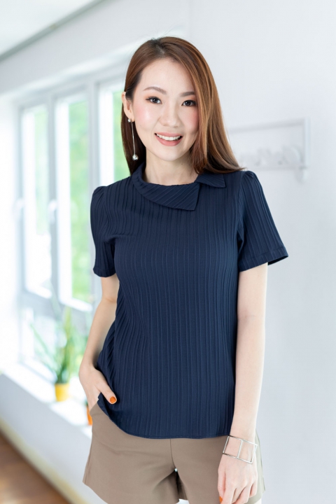 เสื้อดีไซน์คอปกเฉียงๆ แขนสั้น ด้านหลังผ่าหยดน้ำติดกระดุมคอ แพทเทิร์นคอดใต้อกนิดนึง จะเข้ารูปสวยพอดี ใช้ผ้าอัดลายนูนๆ เป็น Texture ลายริ้วยาวลงมา ไม่หนามากแต่ไม่บางโป๊ เนื้อนิ่มใส่สบาย