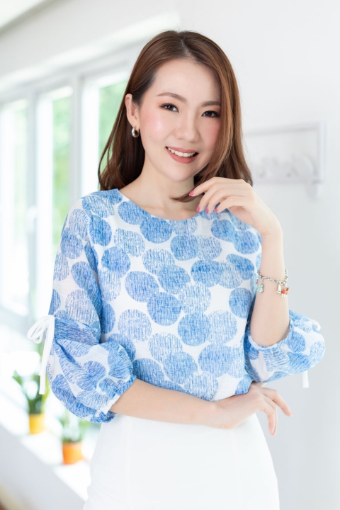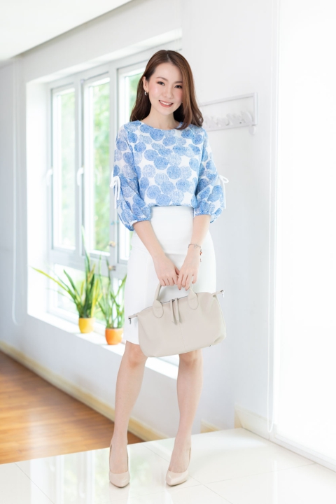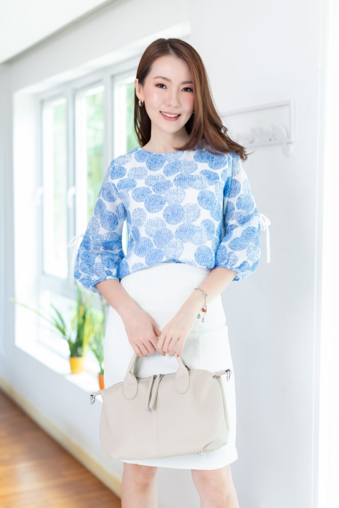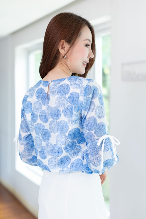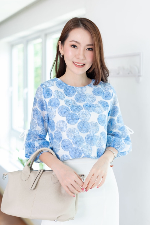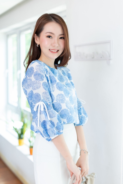เสื้อคอกลมทรงสั้นๆ ชายเสื้อไม่กว้างมากทรงพอดีตัว แบบสวยคลีนใช้ผ้าพิมพ์ลายกราฟิกวงกลม ตัวผ้าทอมีลายในตัว มาพร้อมซับใน เนื้อไม่หนามาก ยับยากแห้งไวแน่นอน แขนสี่ส่วนตัดต่อทรงบอลลูนช่วงปลายแขน แต่งสายโบว์น่ารัก