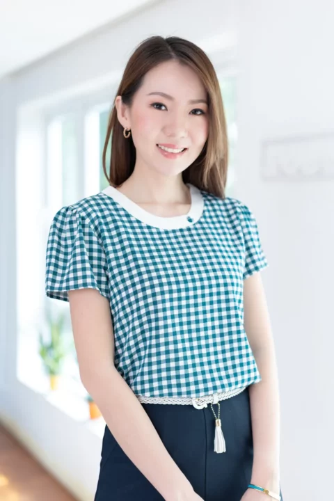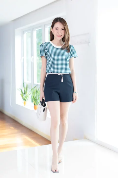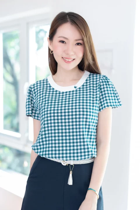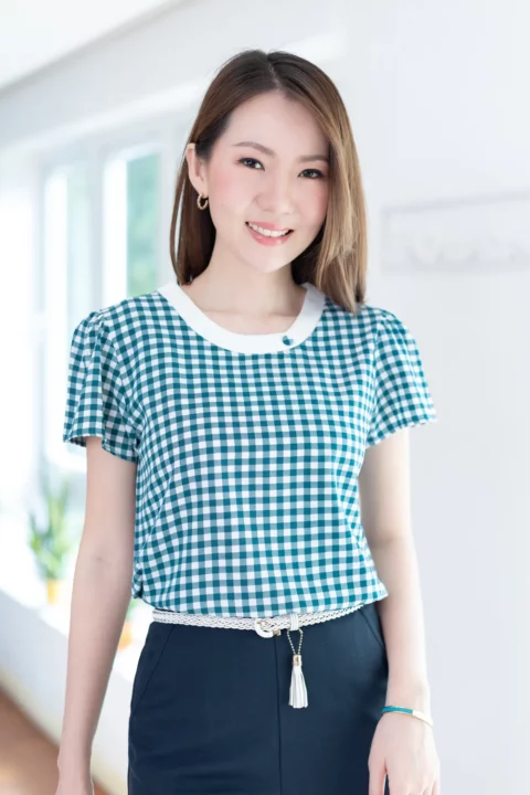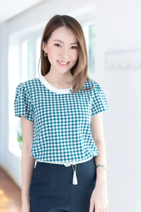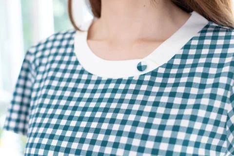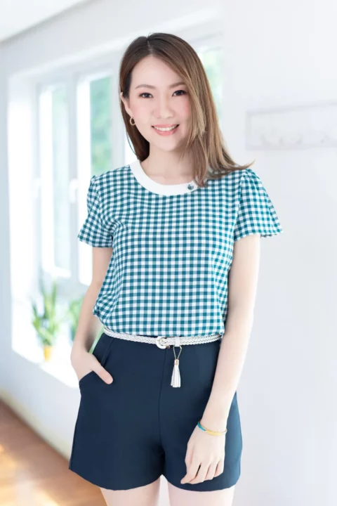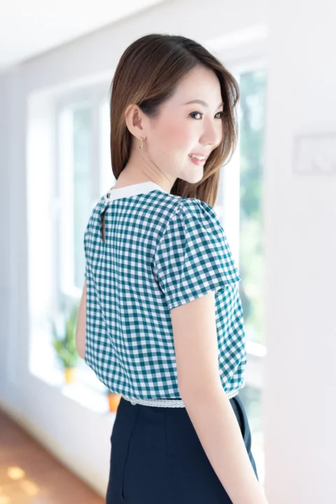 MT3601 Overlap Collar with Button Blouse – Teal Green Gingham