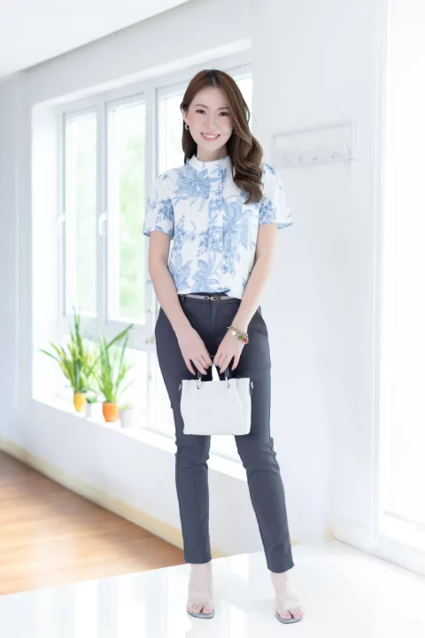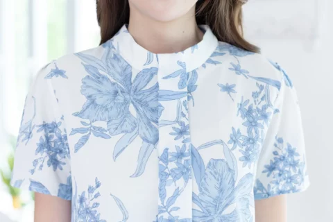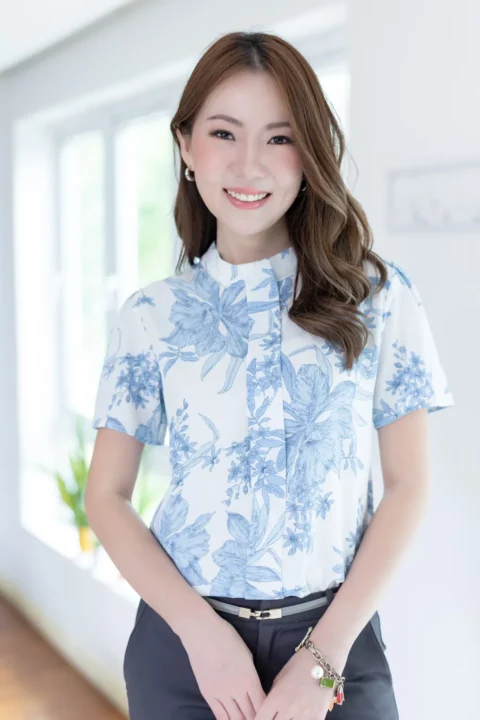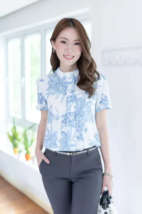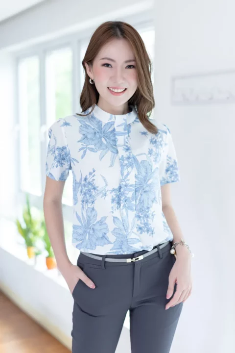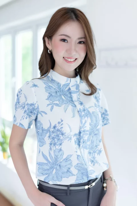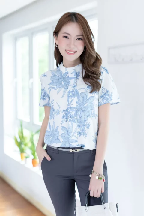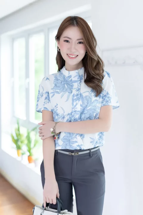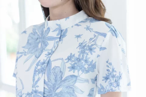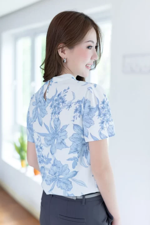 เสื้อคอปิดแต่งสาบหลอกด้านหน้ายาว ทรงแขนสั้นจับจีบหัวไหล่ ตัดเย็บด้วยผ้าไหมอิตาลีเนื้อเนียน ได้ลุคที่ดูหวานขึ้นกว่าสีพื้น แนะนำสำหรับวันที่อยากดูหวานและแอบเก๋ค่า รุ่นนี้ผ่าหยดน้ำติดกระดุมด้านหลัง สวมใส่ง่ายไม่ติดศรีษะ