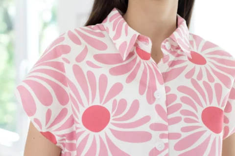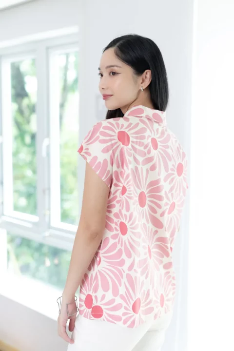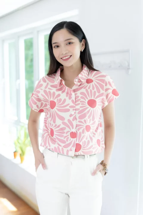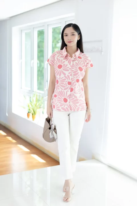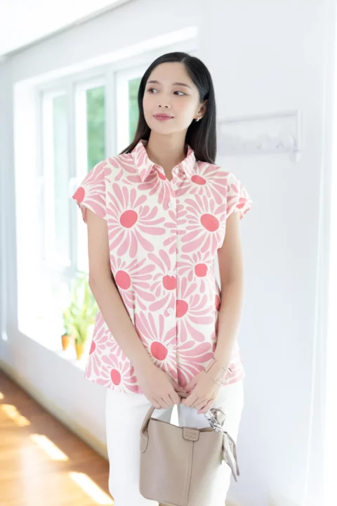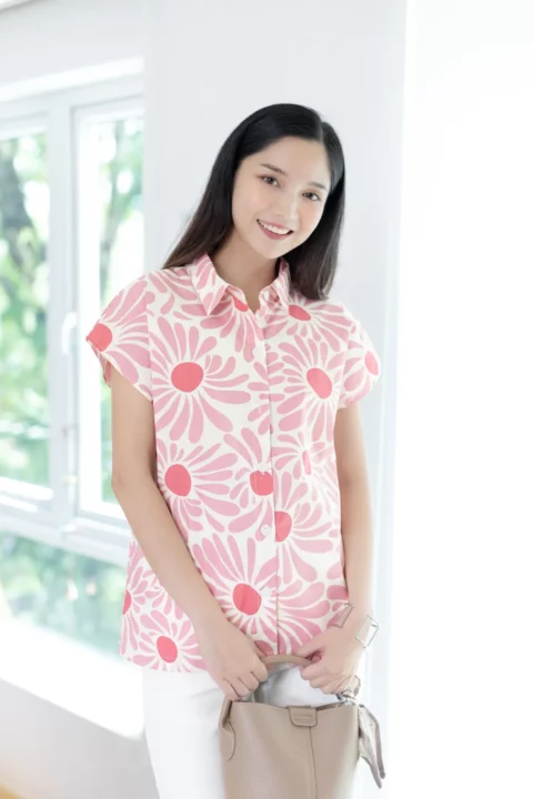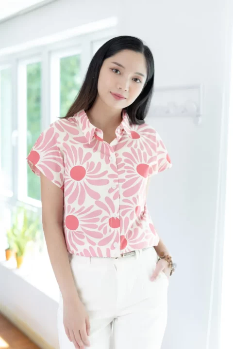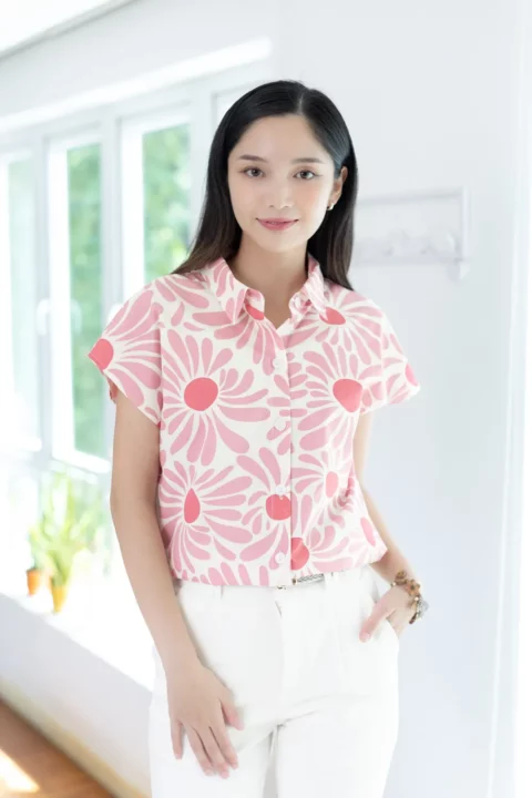เสื้อคอปกแขนล้ำๆ ทรงสบายๆเหมาะกับวันหยุด ผ่ากระดุมหน้า ตัดเย็บด้วยคอตตอนเนื้อนิ่ม พิมพ์ลายดอกไม้ เสื้อโทนสีสดใส ใส่ยังไงก็น่ารักอารมณ์ดี
