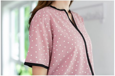 เสื้อทำงานคอกลม ผ่าวีสั้นด้านหน้า แต่งแถบดำเป็นทรงตัว Y ใช้ผ้าพิมพ์ลายจุดเนื้อดี ลื่นๆ ยืดหยุ่นได้นิดๆ ผ้าทอ Texture แนวทแยง ทรงเสื้อใส่ง่ายจับคู่กับกระโปรงหรือกางเกงได้ง่าย ได้ลุคสวย Classy ค่า