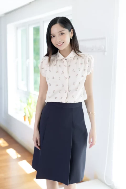 เชิ้ตทรงสบาย ผ่ากระดุมหน้ายาว แต่งสาบปิดกระดุมหน้าได้ลุคคลีนๆ คอปก จับจีบรูดช่วงบ่าทั้ง 2 ข้าง ต่อแขนสั้นซ้อนทรงกลีบดอกไม้ ผ้าเนื้อนิ่ม ใส่สบาย มีลายอัดย่นๆในตัว ลายพิมพ์ดอกกุหลาบเล็กๆ สวยแบบนุ่มนวล