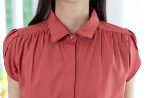 เชิ้ตทรงสบาย ผ่ากระดุมหน้ายาว แต่งสาบปิดกระดุมหน้าได้ลุคคลีนๆ คอปก จับจีบรูดช่วงบ่าทั้ง 2 ข้าง ต่อแขนสั้นซ้อนทรงกลีบดอกไม้ ผ้าเนื้อนิ่ม ใส่สบาย ไม่หนา แต่ไม่โปร่งแสงมาก