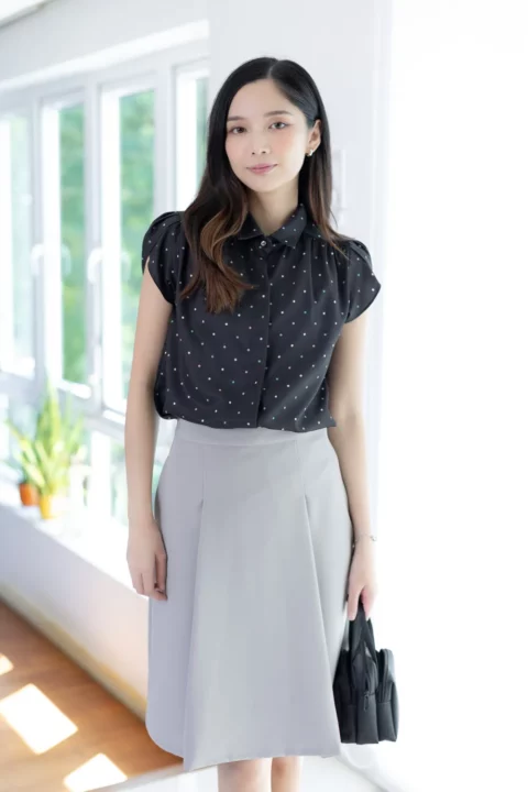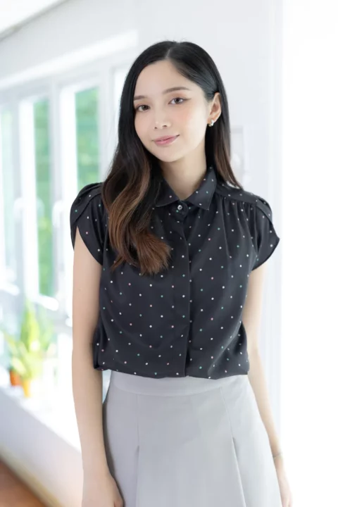เชิ้ตทรงสบาย ผ่ากระดุมหน้ายาว แต่งสาบปิดกระดุมหน้าได้ลุคคลีนๆ คอปก จับจีบรูดช่วงบ่าทั้ง 2 ข้าง ต่อแขนสั้นซ้อนทรงกลีบดอกไม้ ผ้าเนื้อนิ่ม ใส่สบาย มีลายอัดย่นๆในตัว ลายพิมพ์จุดจิ๋วน่ารักมั่กก