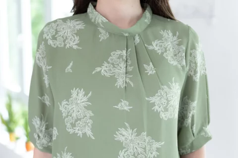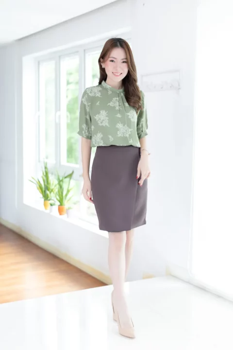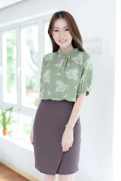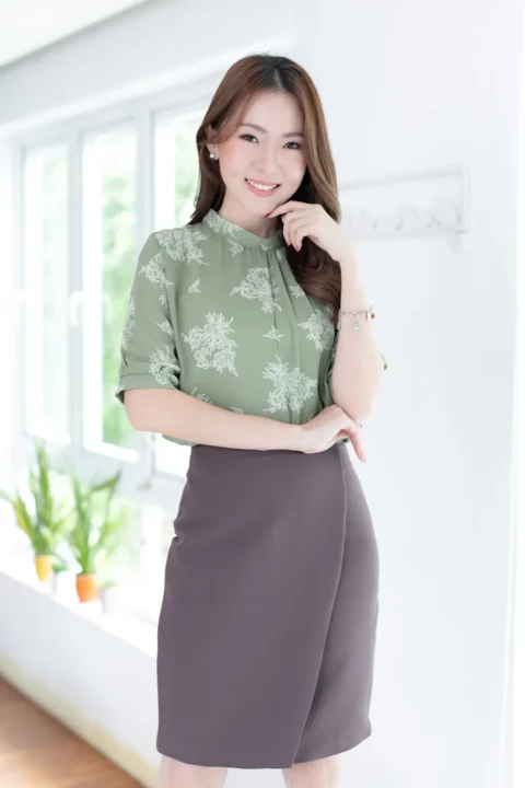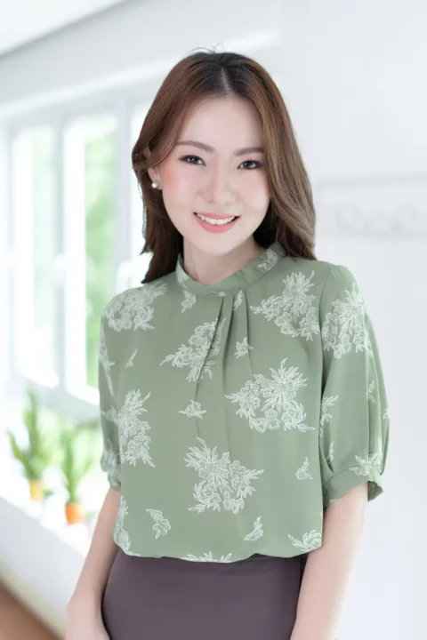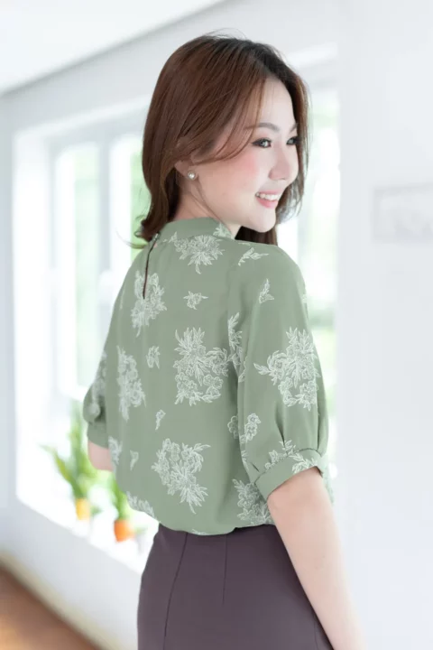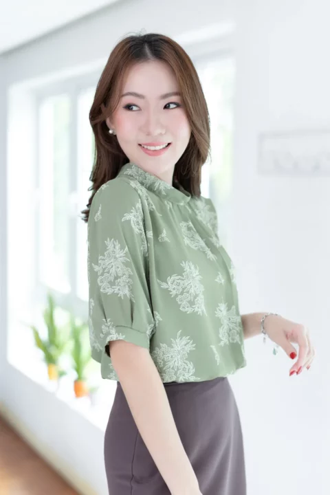 เสื้อทรงเรียบร้อย คอปิดตั้งนิดๆจับจีบซ้อนกันใต้คอฝั่งซ้าย ต่อแขนตุ๊กตา รุ่นนี้แขนยาวกว่าปกติเกือบถึงช่วงศอก(ขึ้นอยู่กับสรีระ) ด้านหลังผ่าหยดน้ำติดกระดุม ผ้าลายดอกไม้ ใส่แล้วรู้สึกดี ทรงสุภาพใส่ไปทำงานได้ ทรงเสื้อไม่ยาวมากจับคู่กับเอวสูงจะกำลังพอดีค่ะ