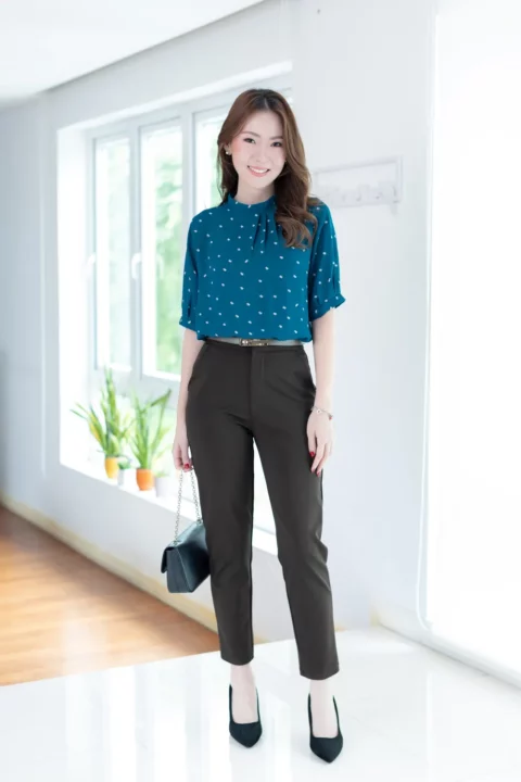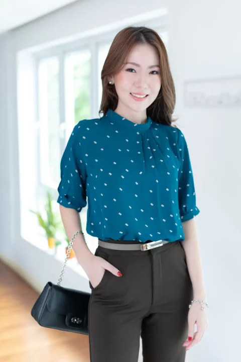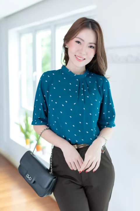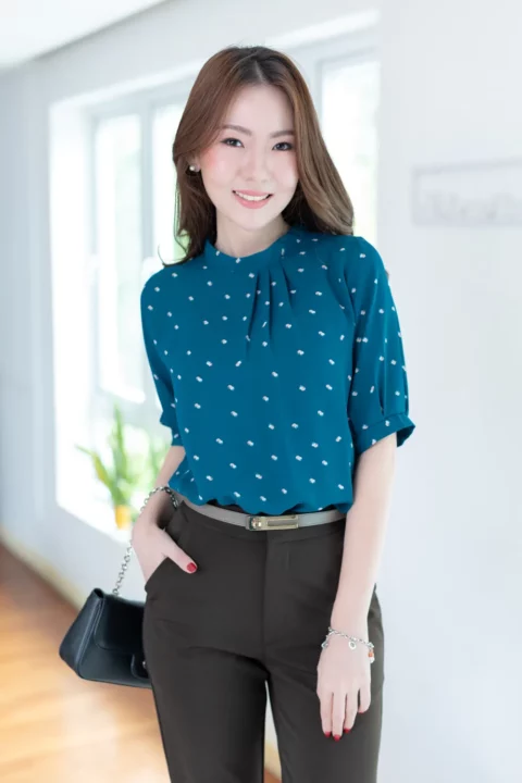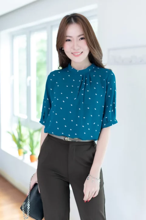 MN0520 Side Pleat Graphic Blouse – Ocean Green