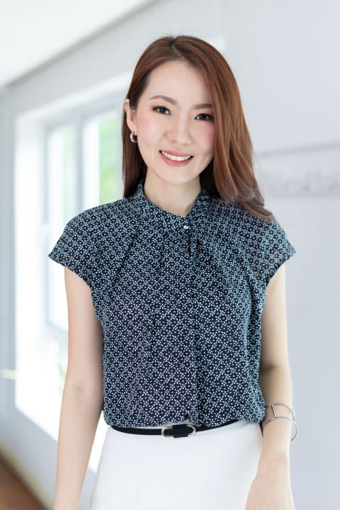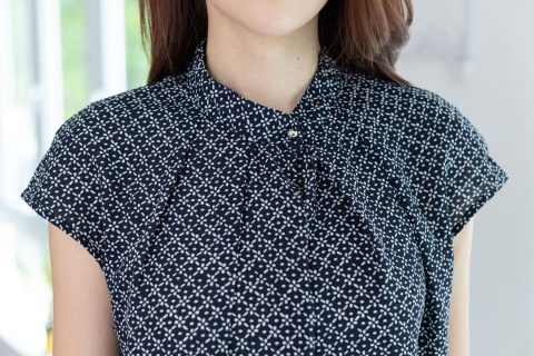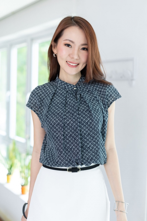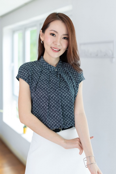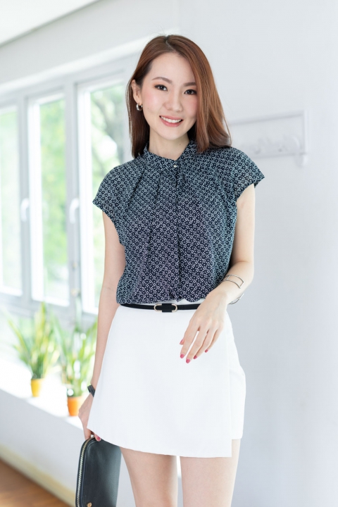 เสื้อแขนกุดไหล่ล้ำหน่อยๆ แต่งขอบคอปิด ผ่าด้านหน้าติดกระดุม จีบใต้คอโชว์ความพลิ้ว ผ้าพิมพ์ลายกราฟิก ทรงสวยสบาย สไตล์เก๋