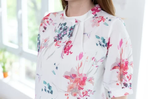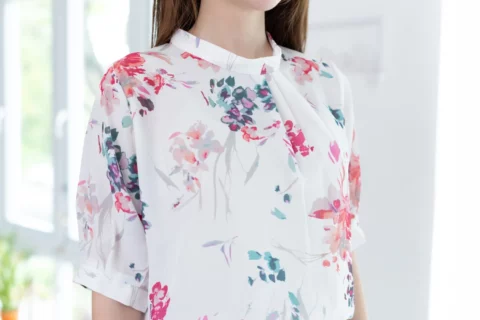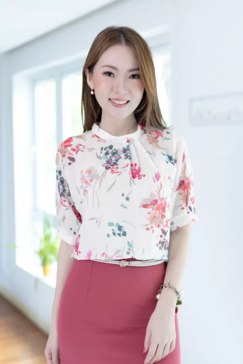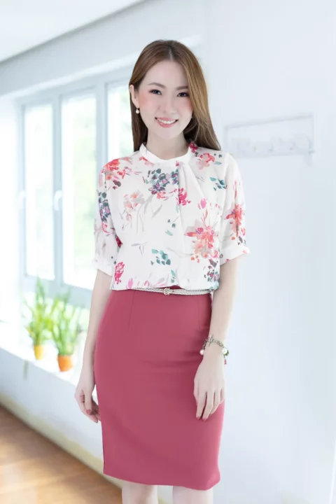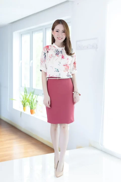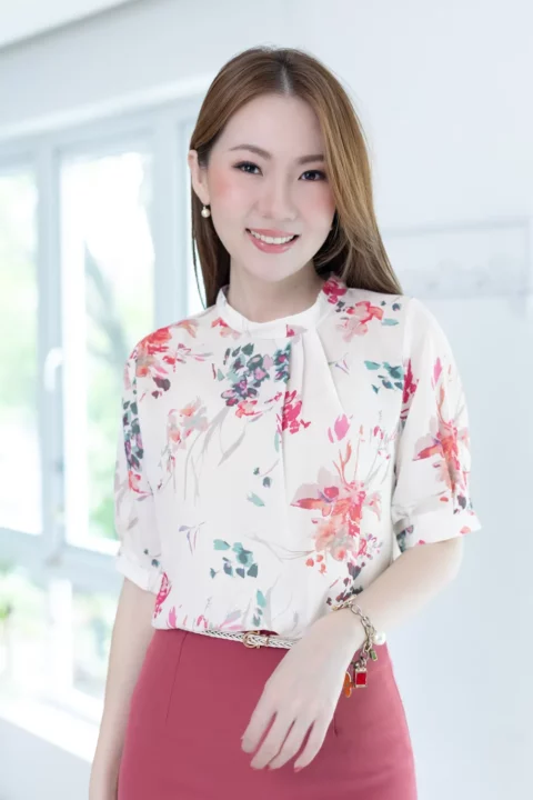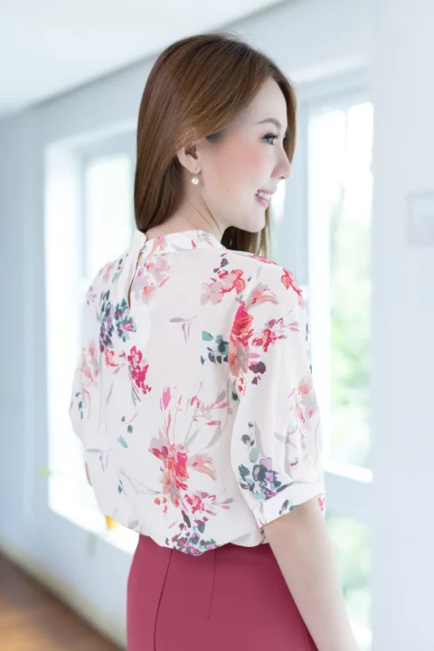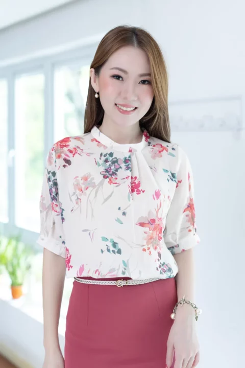 เสื้อทรงเรียบร้อย คอปิดตั้งนิดๆแต่งจีบซ้อนกันใต้คอฝั่งซ้าย ต่อแขนตุ๊กตา รุ่นนี้แขนยาวกว่าปกติเกือบถึงช่วงศอก(ขึ้นอยู่กับสรีระ) ด้านหลังผ่าหยดน้ำติดกระดุม ผ้าลายดอกไม้ ใส่แล้วรู้สึกดี ทรงสุภาพใส่ไปทำงานได้ ทรงเสื้อไม่ยาวมากจับคู่กับเอวสูงจะกำลังพอดีค่ะ