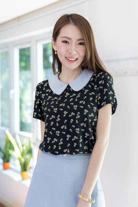 เสื้อสวยเรียบร้อย พิมพ์ลายดอกกุหลาบจิ๋ว ต่อปกบัวสีพื้น ผ่าหยดน้ำติดกระดุมคอด้านหลัง แขนสั้นจับจีบหัวไหล่เบาๆ ใส่ทำงานทรงสวย ผ้าเนื้อดี นิ่มสบาย ใส่สวยตลอดกาลเลยค่ะ