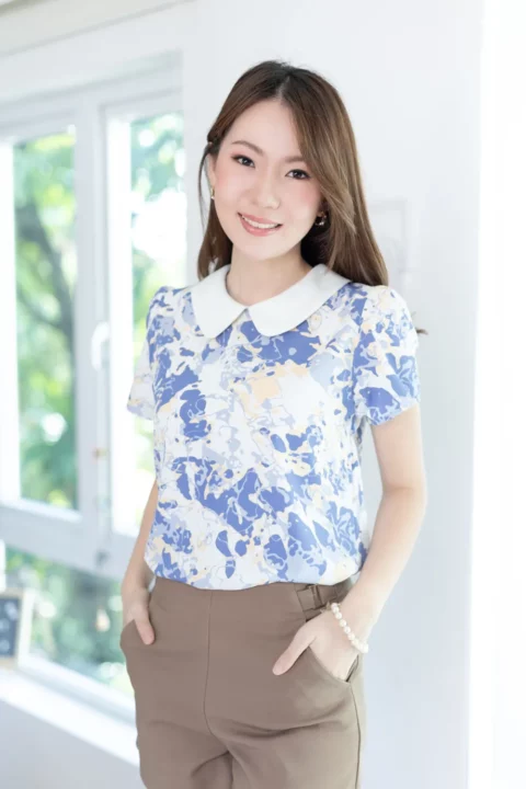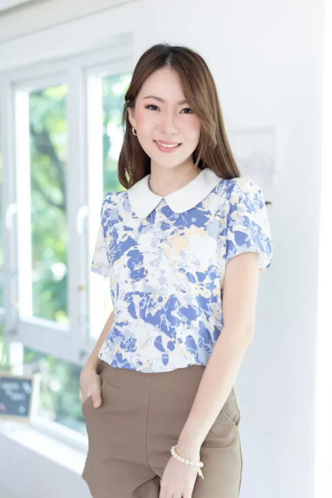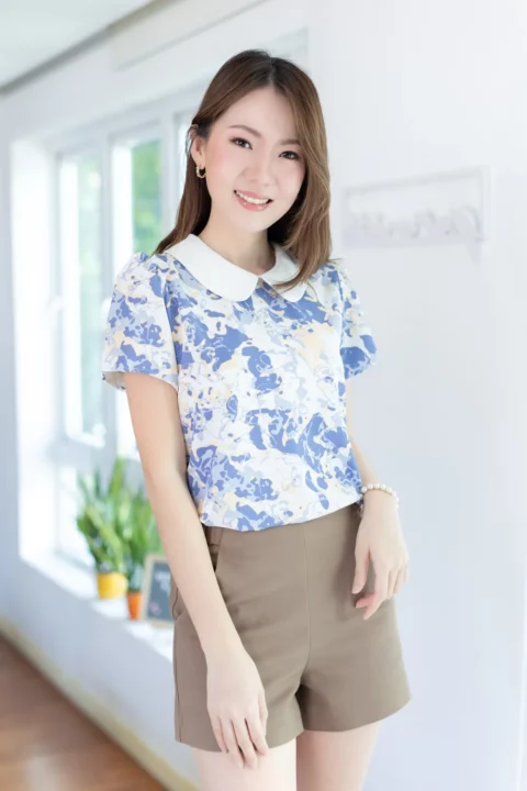 เสื้อสวยเรียบร้อย พิมพ์ลายกราฟิก ต่อปกบัวสีพื้น ผ่าหยดน้ำติดกระดุมคอด้านหลัง แขนสั้นจับจีบหัวไหล่เบาๆ ใส่ทำงานทรงสวย ผ้าเนื้อดี ดูแลง่าย ยับยาก แห้งไว