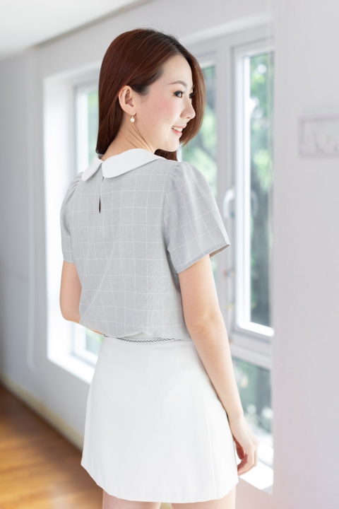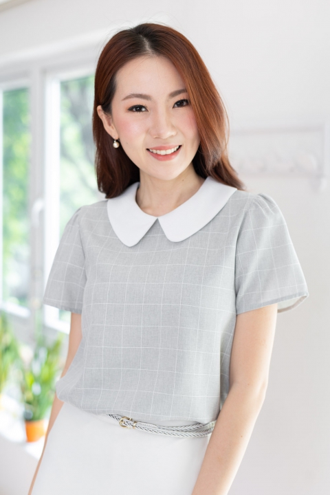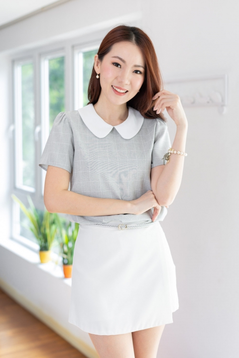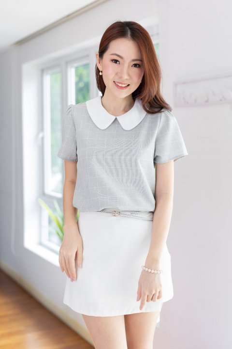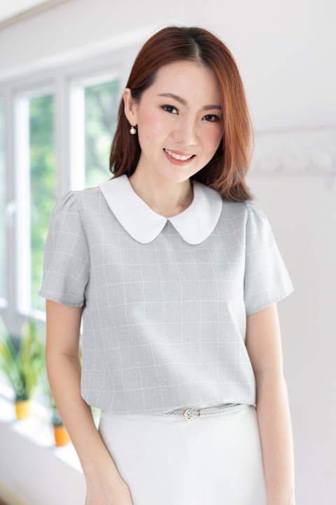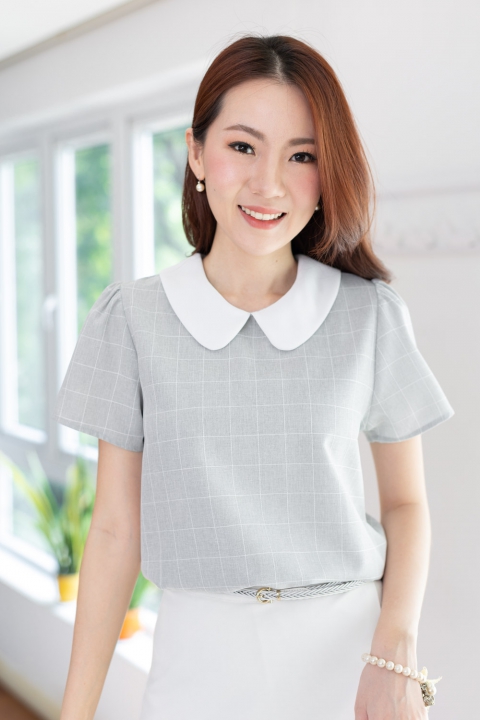เสื้อสวยเรียบร้อยต่อปกบัวสีพื้น ผ่าหยดน้ำติดกระดุมคอด้านหลัง แขนสั้นจับจีบหัวไหล่เบาๆ ใส่ทำงานทรงสวย ตัวผ้าทอมีลายตารางเส้นขาวแบบนูนนิดๆ ดูมี Texture หน่อยๆ ไม่หนาไม่บาง ใส่สวยตลอดกาลเลยค่ะ