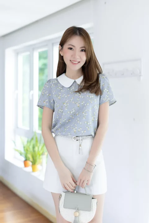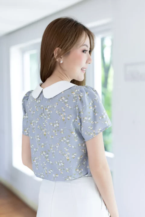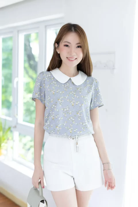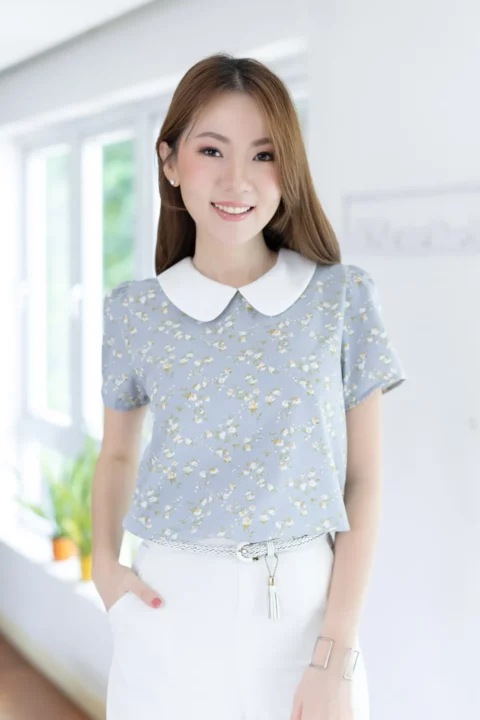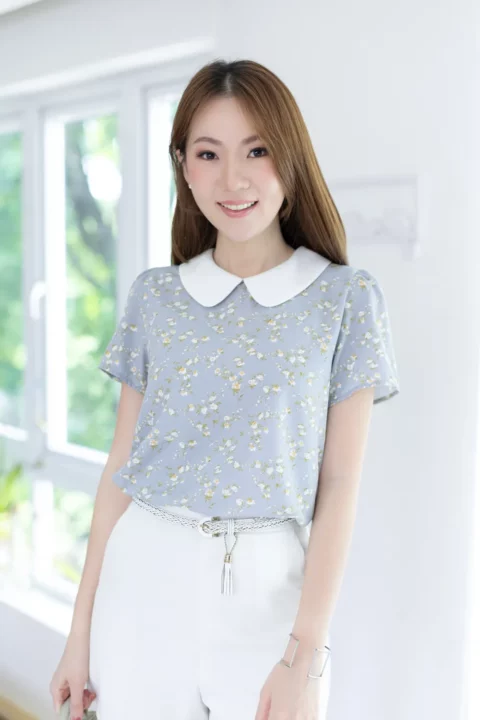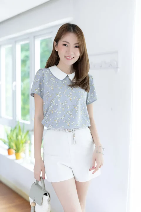 เสื้อสวยเรียบร้อย พิมพ์ลายดอกไม้ ต่อปกบัวสีพื้น ผ่าหยดน้ำติดกระดุมคอด้านหลัง แขนสั้นจับจีบหัวไหล่เบาๆ ใส่ทำงานทรงสวย ผ้าเนื้อดี นิ่มสบาย ใส่สวยตลอดกาลเลยค่ะ