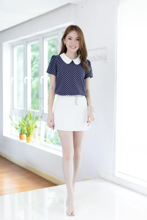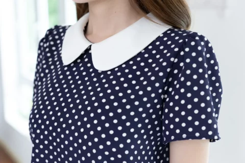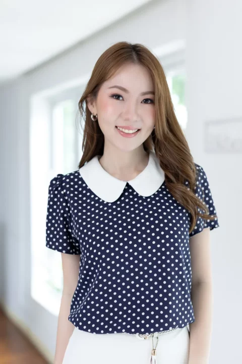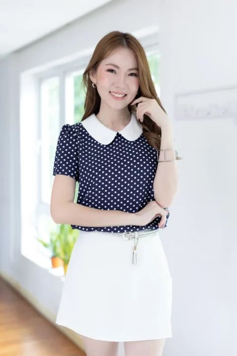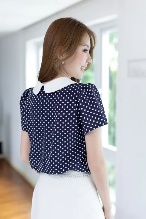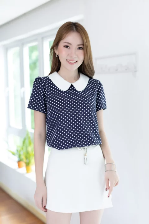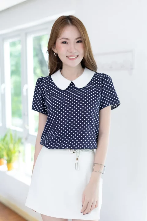 เสื้อสวยเรียบร้อย พิมพ์ลายจุด ต่อปกบัวสีพื้น ผ่าหยดน้ำติดกระดุมคอด้านหลัง แขนสั้นจับจีบหัวไหล่เบาๆ ใส่ทำงานทรงสวย ผ้าเนื้อดี นิ่มสบาย ใส่สวยตลอดกาลเลยค่ะ