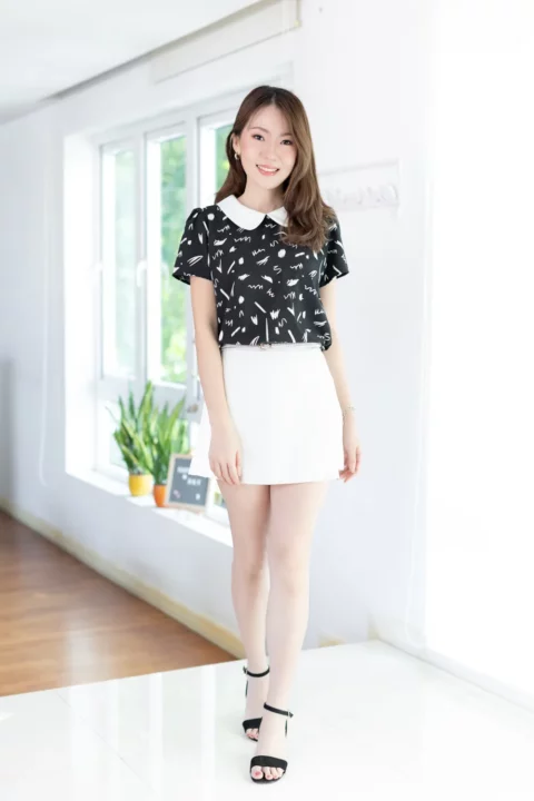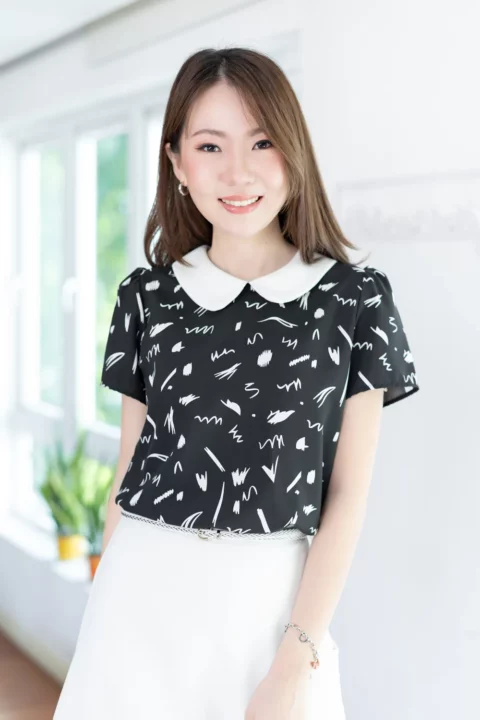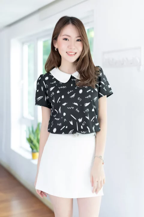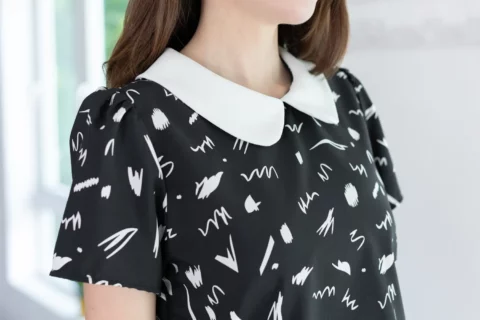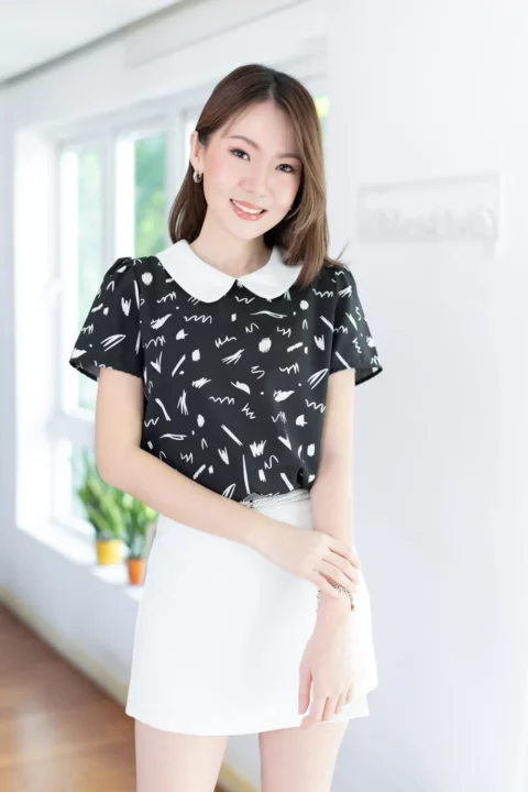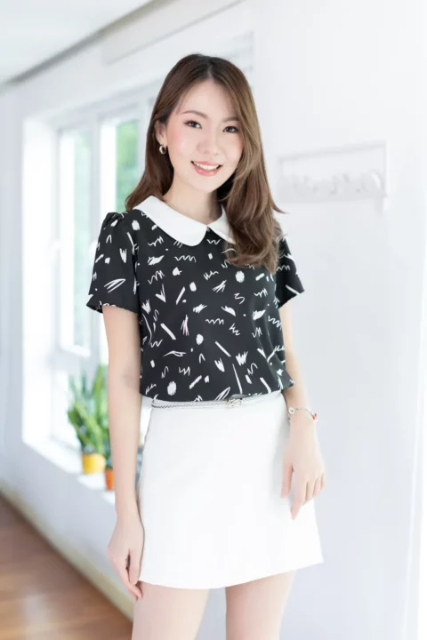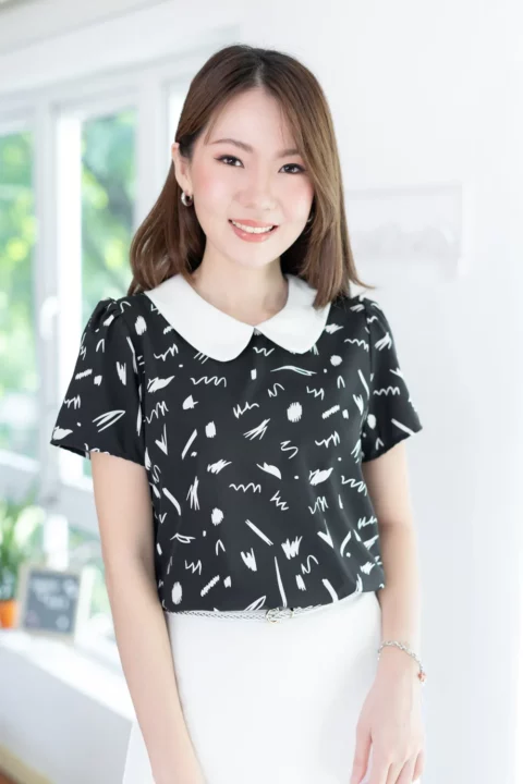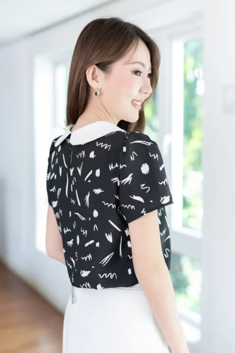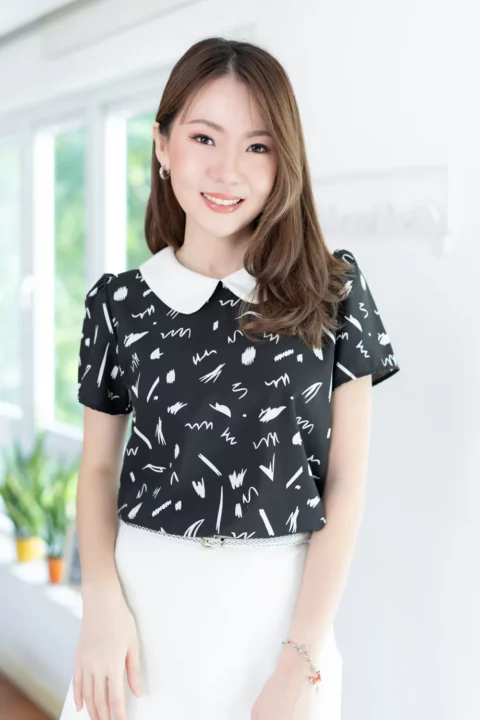 เสื้อสวยเรียบร้อย พิมพ์ลายกราฟิก ต่อปกบัวสีพื้น ผ่าหยดน้ำติดกระดุมคอด้านหลัง แขนสั้นจับจีบหัวไหล่เบาๆ ใส่ทำงานทรงสวย ผ้าไหมอิตาลีผิวเรียบเนียน ดูแลง่าย ยับยาก แห้งไว