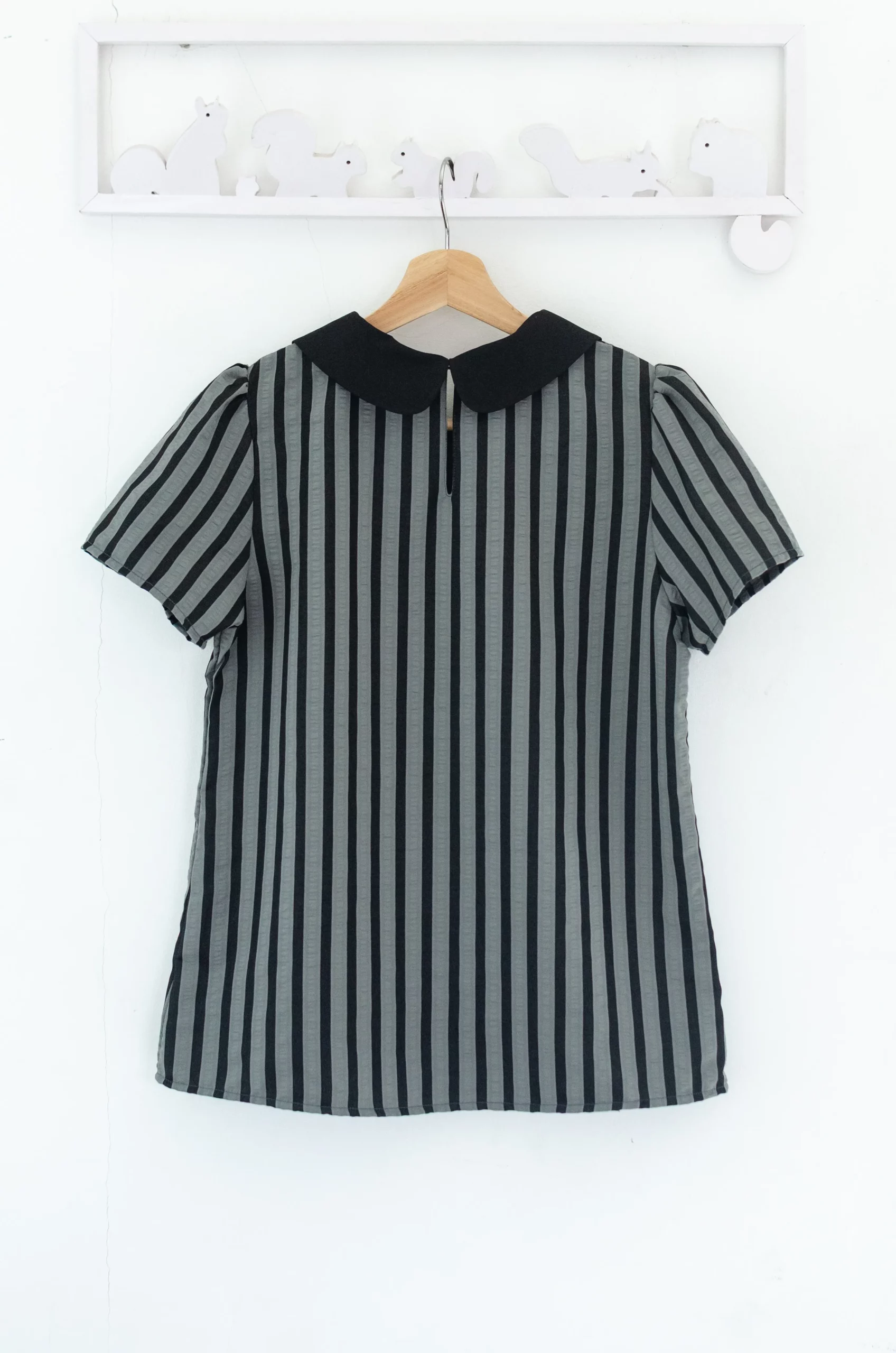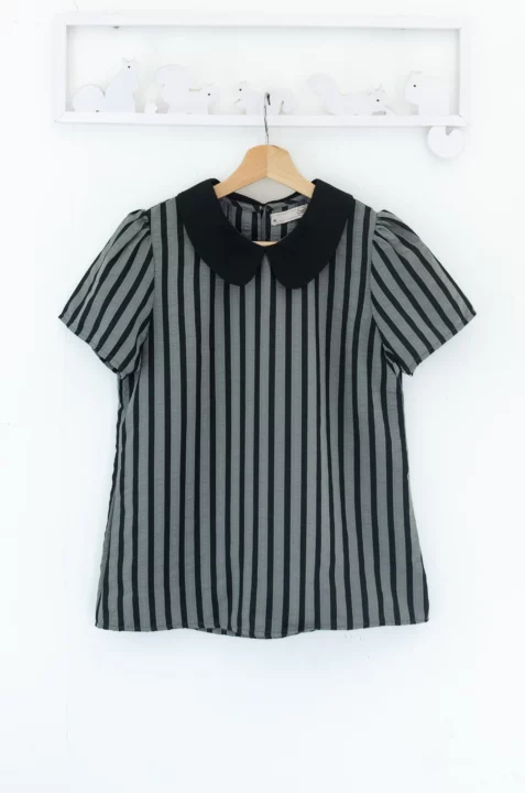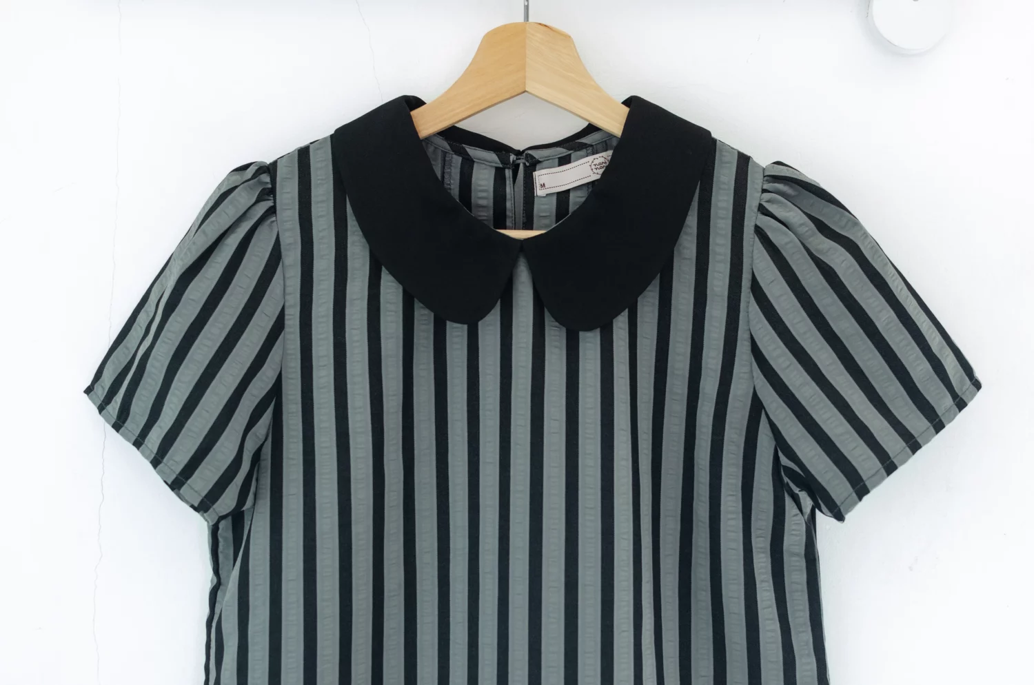 เสื้อสวยเรียบร้อย คอกลมต่อปกบัวสีพื้น ผ่าหยดน้ำติดกระดุมคอด้านหลัง แขนสั้นจับจีบหัวไหล่เบาๆ ใส่ทำงานทรงสวย ผ้าเนื้อดี ทอลายริ้วย่นสลับเรียบ เนื้อไม่หนามากแต่ไม่โปร่งแสงมาก