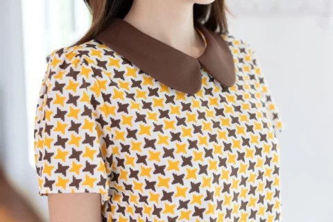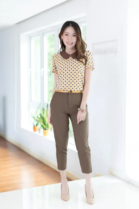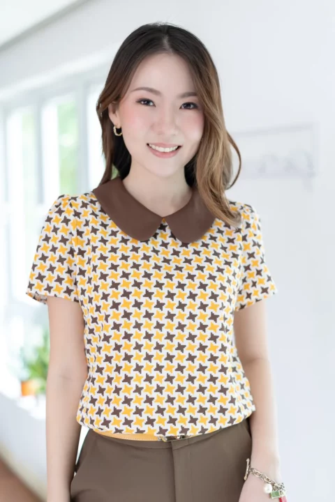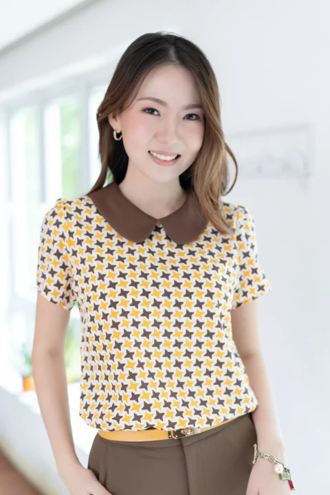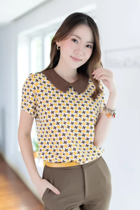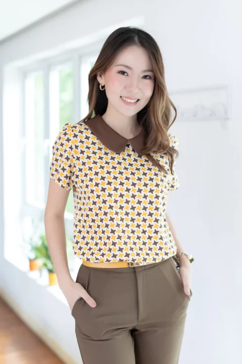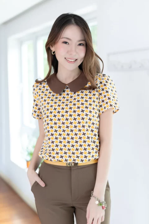 เสื้อสวยเรียบร้อย พิมพ์ลายกราฟิก ต่อปกบัวสีพื้น ผ่าหยดน้ำติดกระดุมคอด้านหลัง แขนสั้นจับจีบหัวไหล่เบาๆ ใส่ทำงานทรงสวย ผ้าเนื้อดี ดูแลง่าย ยับยาก แห้งไว