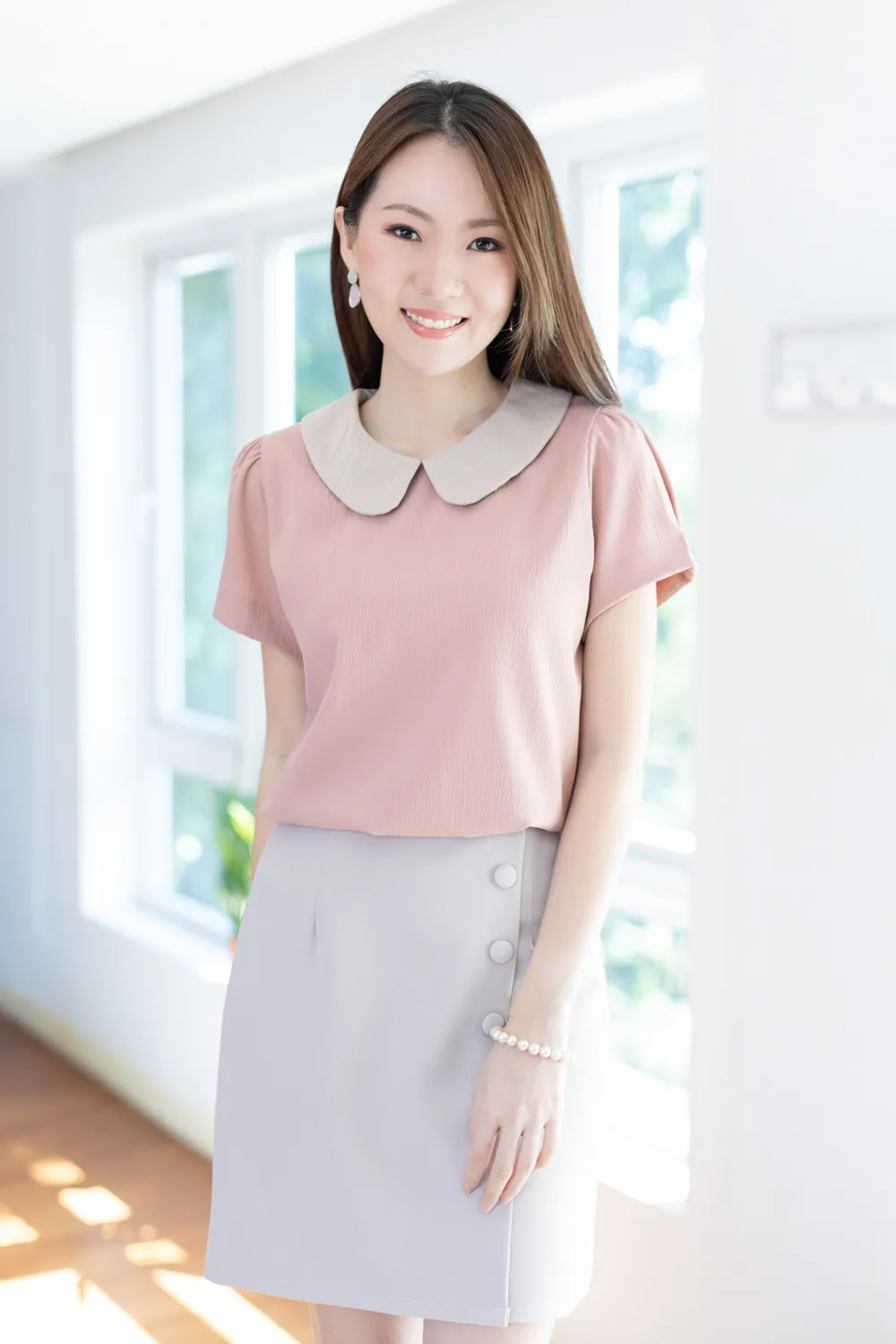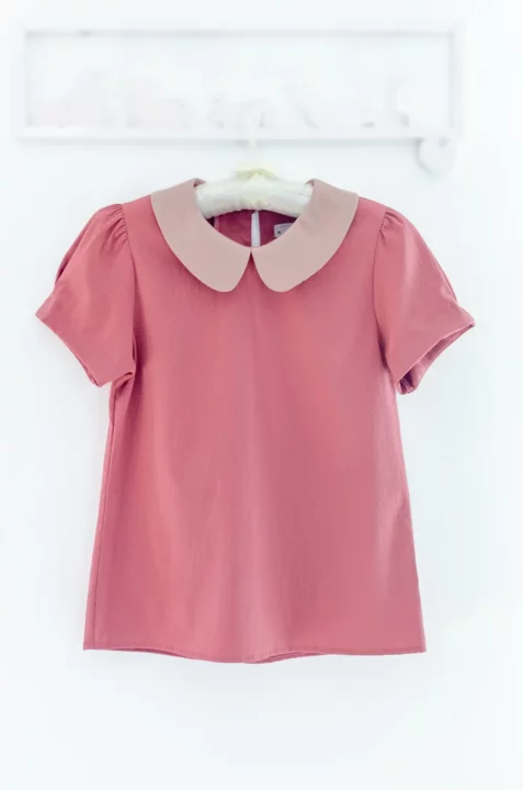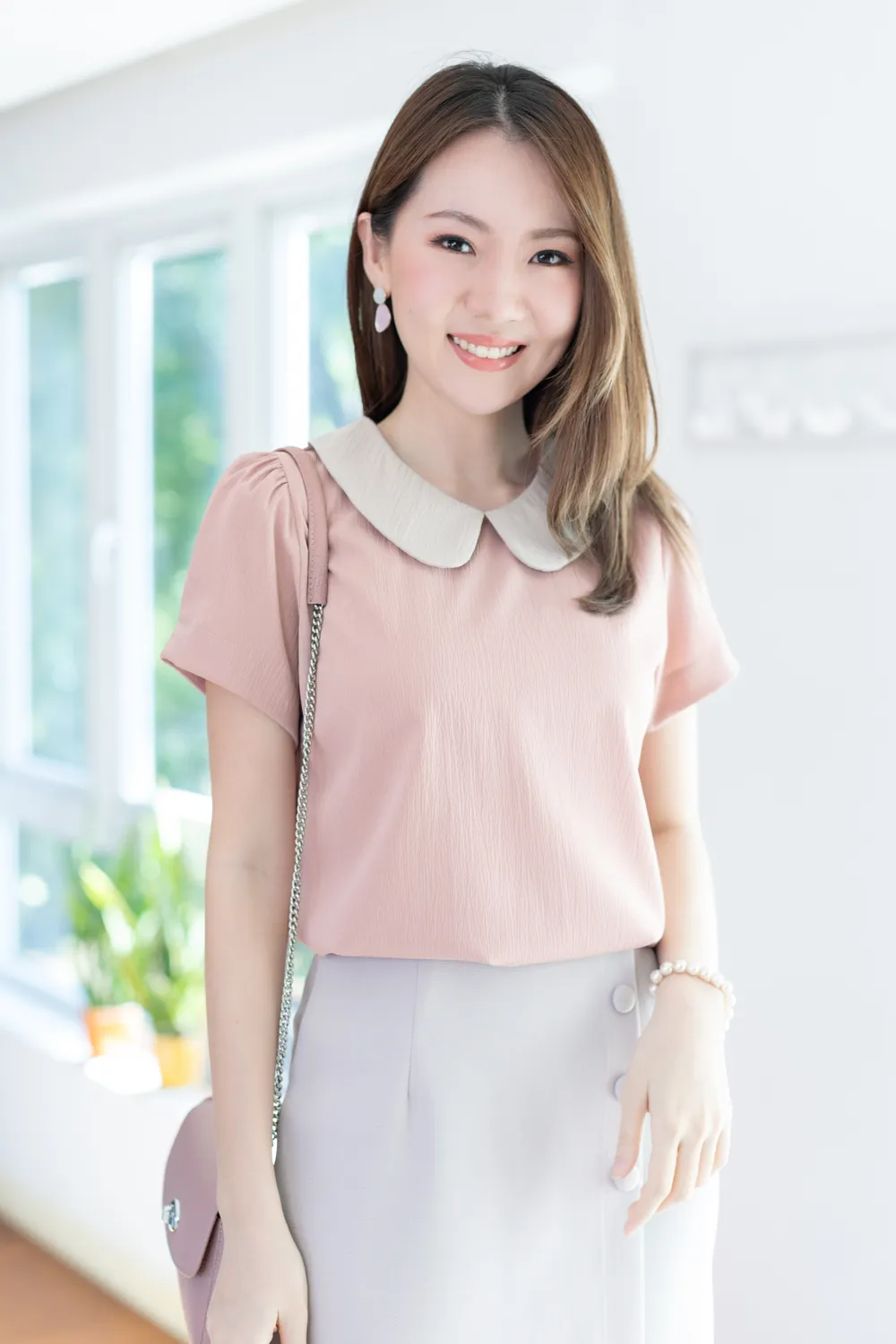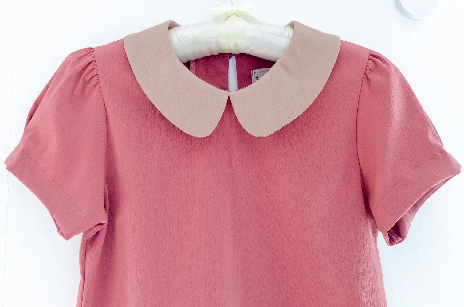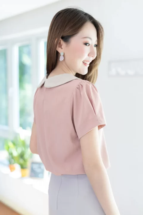 เสื้อที่ให้ลุคน่ารัก เนื้อผ้าย่นเป็นลายในตัว เรียบร้อยแต่ดูน่าสนใจ คอแต่งปกบัวสีพื้น แขนสั้นจับจีบที่ปลายแขน ดูพองนิดๆ ผ่าหยดน้ำหลังคอติดกระดุม ทรงใส่ง่าย