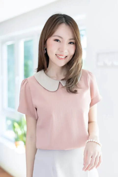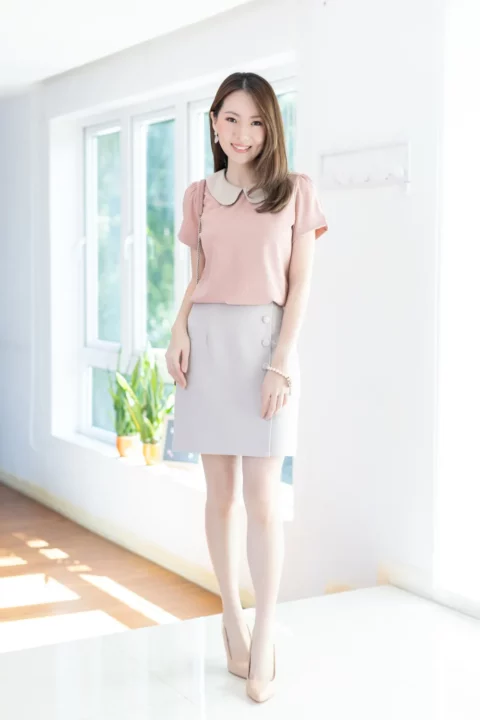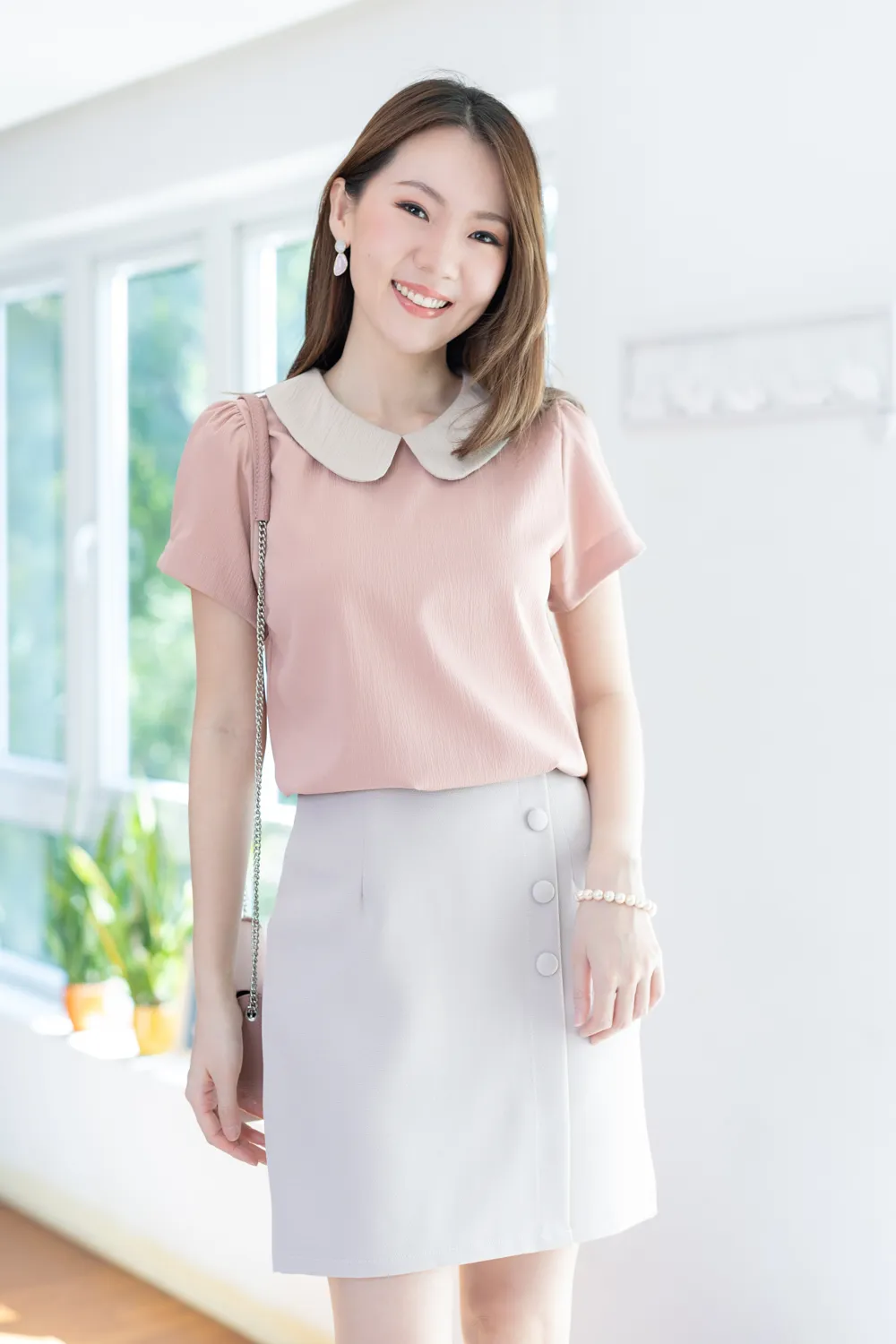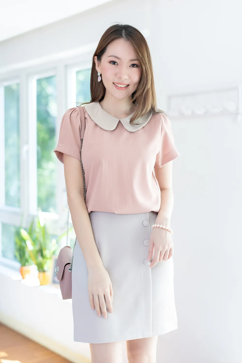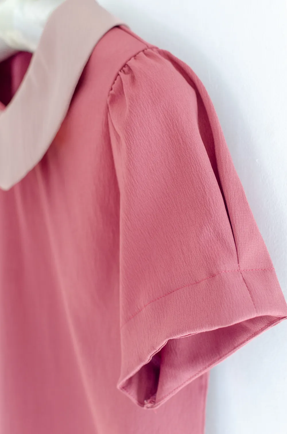 เสื้อที่ให้ลุคน่ารัก เนื้อผ้าย่นเป็นลายในตัว เรียบร้อยแต่ดูน่าสนใจ คอแต่งปกบัวสีพื้น แขนสั้นจับจีบที่ปลายแขน ดูพองนิดๆ ผ่าหยดน้ำหลังคอติดกระดุม ทรงใส่ง่าย