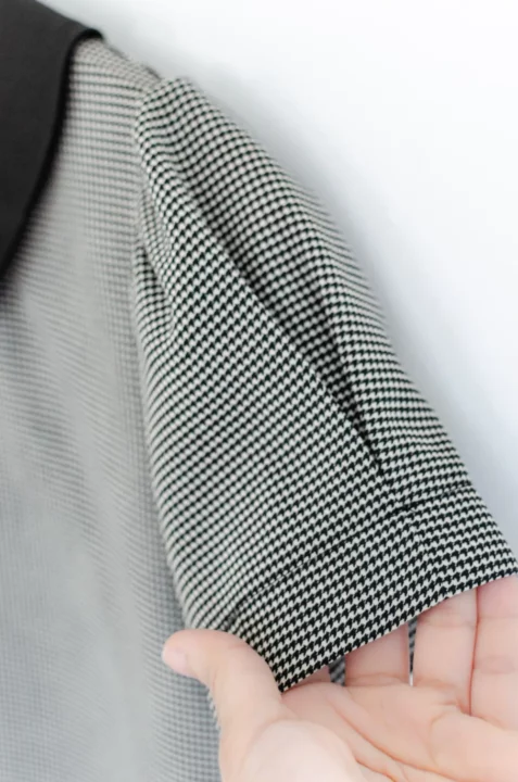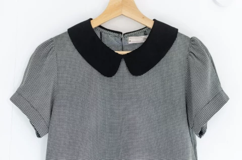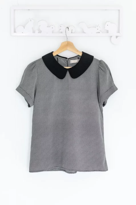 เสื้อที่ให้ลุคน่ารัก ปกบัวสีพื้น แขนสั้นจับจีบที่ปลายแขนดูพองนิดๆ ผ่าหยดน้ำหลังคอติดกระดุมสวมสะดวก ทรงเรียบร้อยดูดี ผ้าพิมพ์ลายกราฟิก ใส่ง่ายแมทช์ง่าย