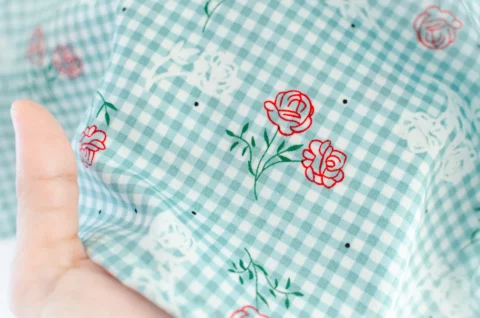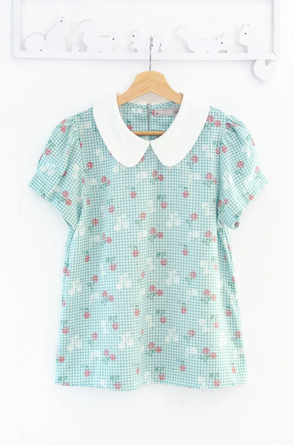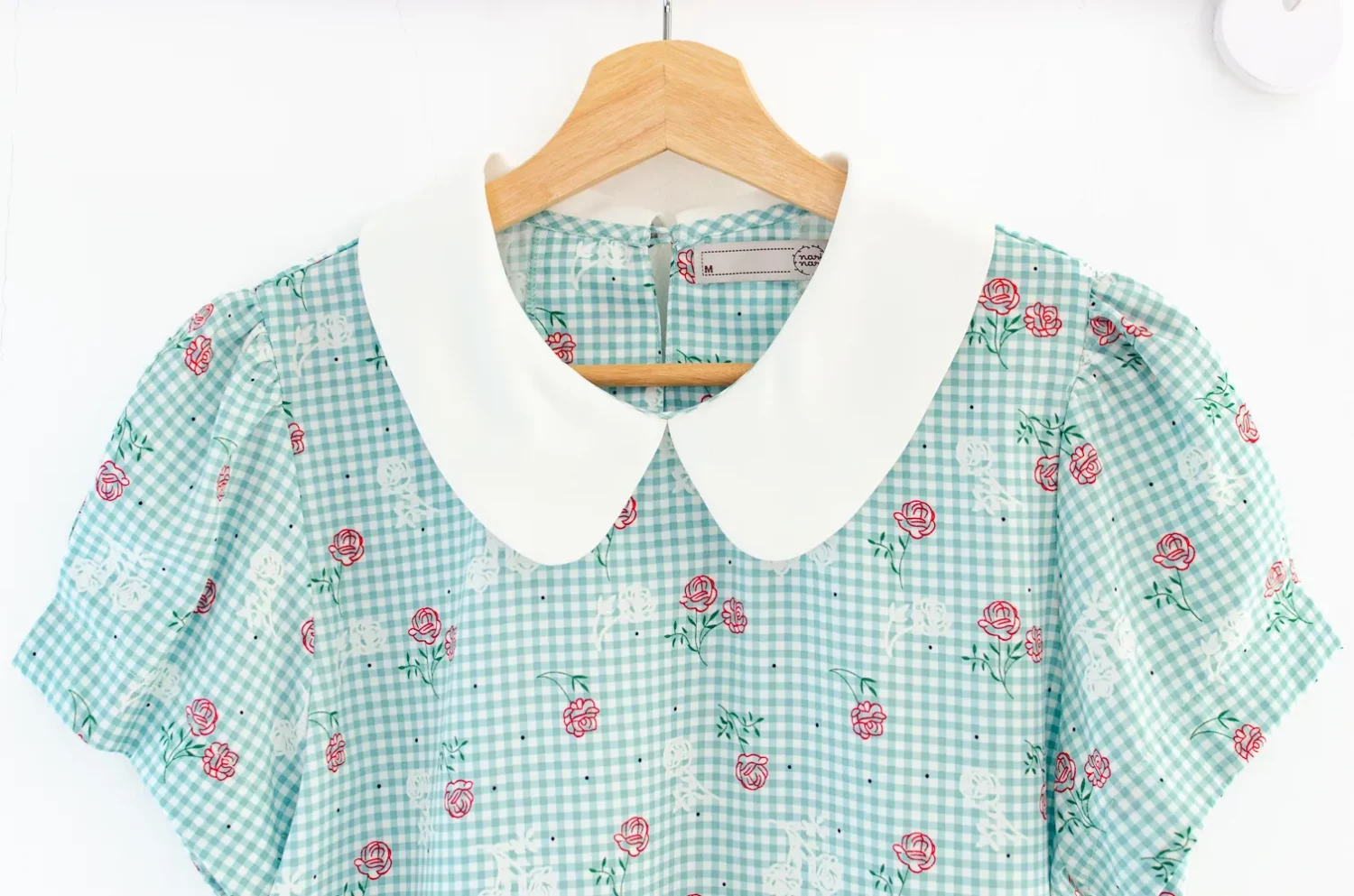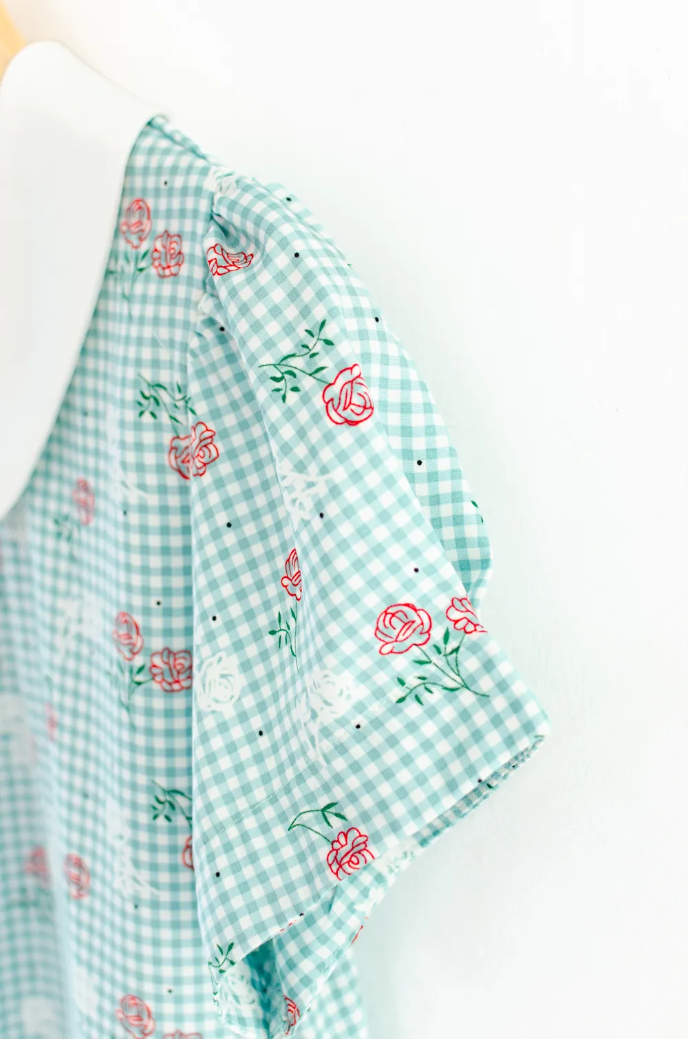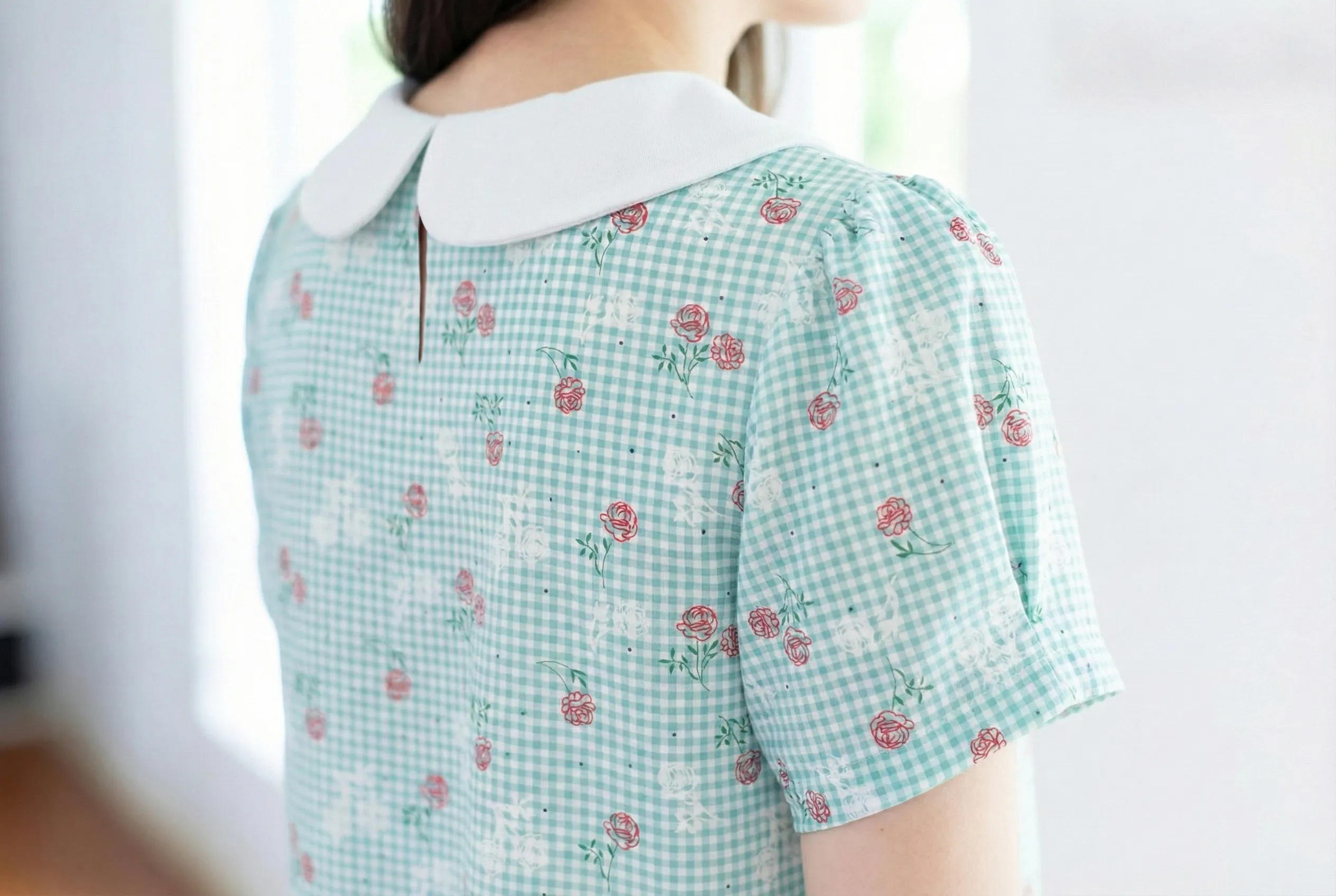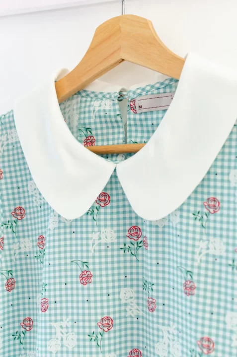 เสื้อที่ให้ลุคน่ารัก ปกบัวสีพื้น แขนสั้นจับจีบที่ปลายแขนดูพองนิดๆ ผ่าหยดน้ำหลังคอติดกระดุมสวมสะดวก ทรงเรียบร้อยดูดี ผ้าพิมพ์ลายตารางเล็ก พร้อมกุหลาบ และจุดจิ๋ว ดูน่ารัก ใส่ง่ายแมทช์ง่าย