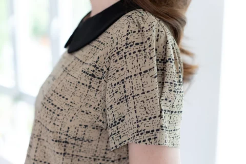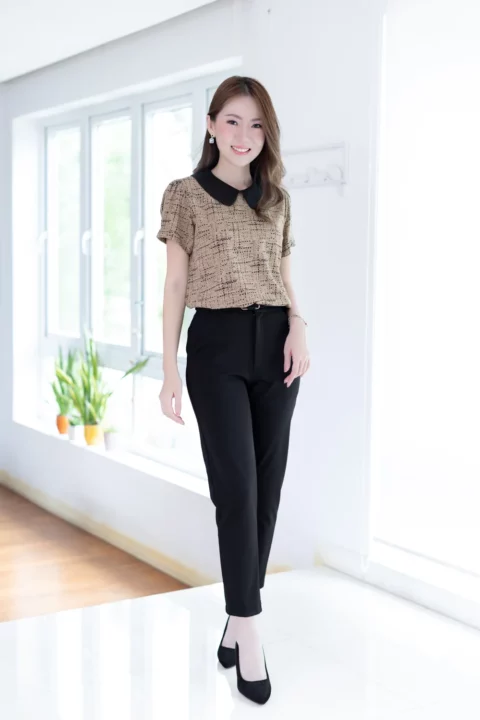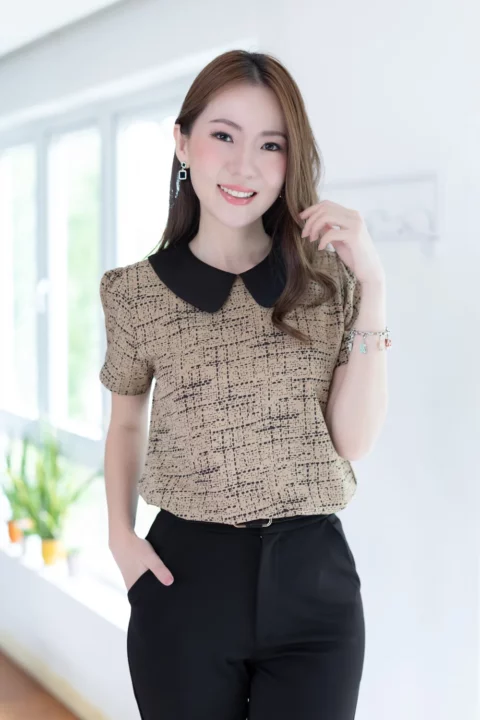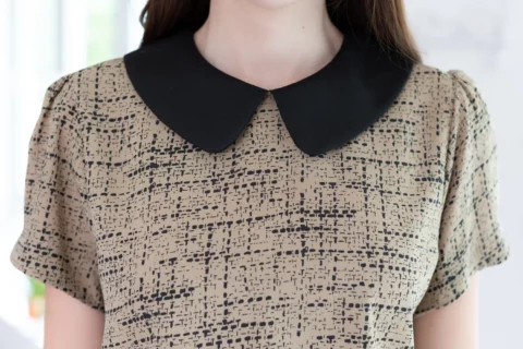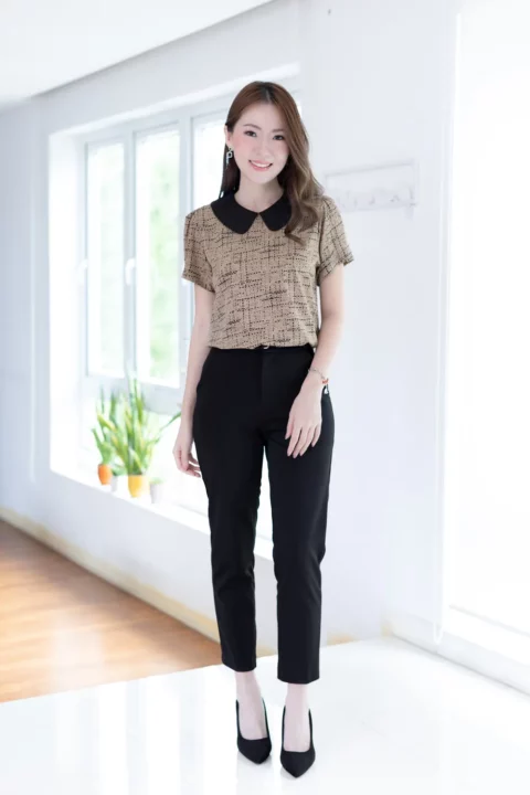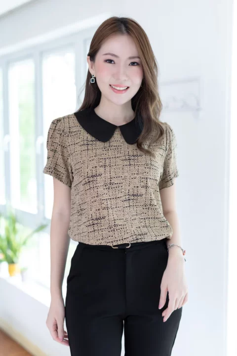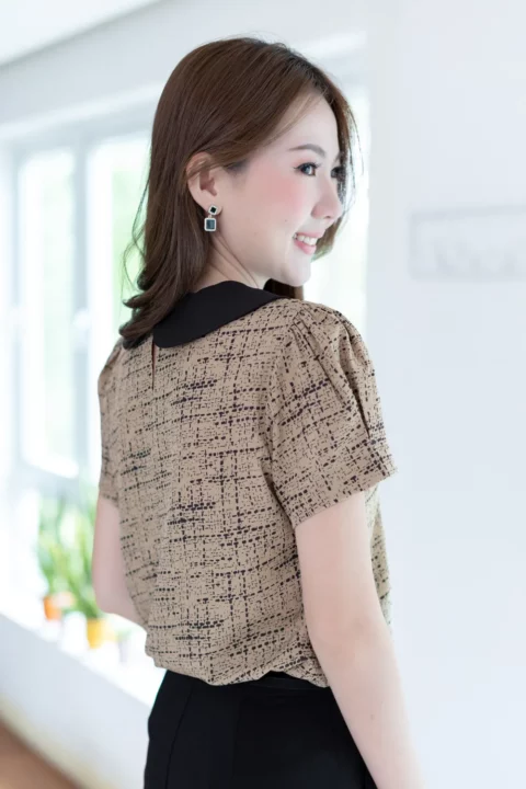 เสื้อที่ให้ลุคน่ารัก ปกบัวสีพื้น แขนสั้นจับจีบที่ปลายแขนดูพองนิดๆ ผ่าหยดน้ำหลังคอติดกระดุมสวมสะดวก ทรงเรียบร้อยดูดี ผ้าพิมพ์ลายกราฟิก ใส่ง่ายแมทช์ง่าย