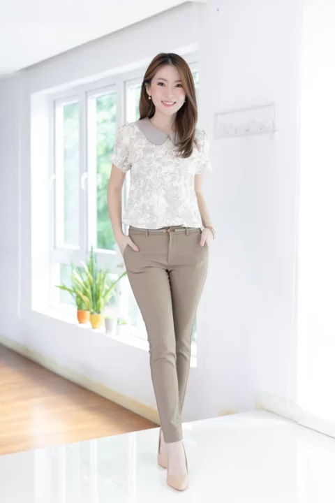 Size 38 – รอบอก 38”, คอกว้าง 7”, ไหล่ 14”, แขนยาว 7.5”, รอบวงแขน 19”, รอบปลายแขน 13”, ยาว 24”, รอบชายเสื้อ 42”