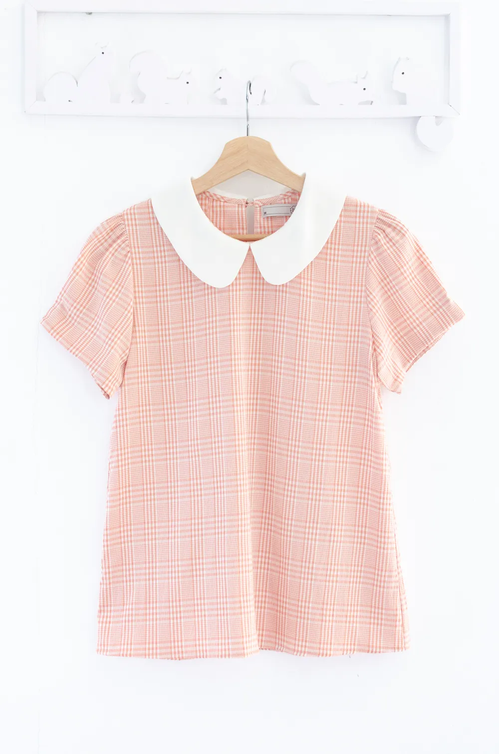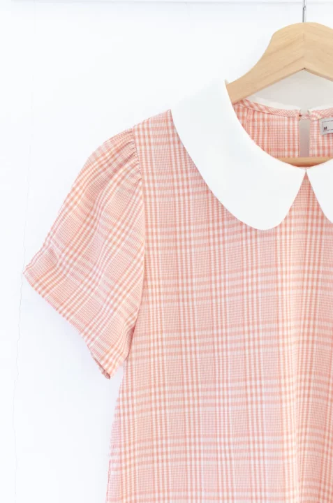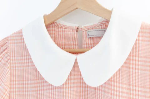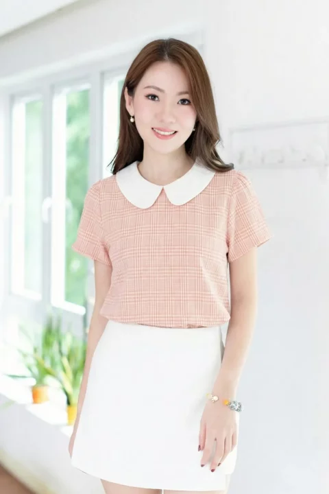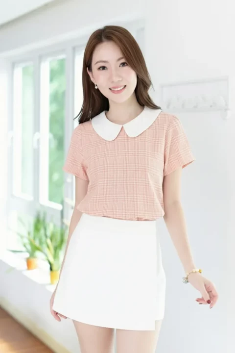 เสื้อที่ให้ลุคน่ารัก ปกบัวสีพื้น แขนสั้นจับจีบที่ปลายแขนดูพองนิดๆ ผ่าหยดน้ำหลังคอติดกระดุมสวมสะดวก ทรงเรียบร้อยดูดี ใช้เนื้อผ้าเรยอนสก็อต ย่นๆในตัว ผ้านิ่มไม่หนา สีหวานกำลังดี