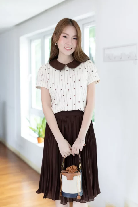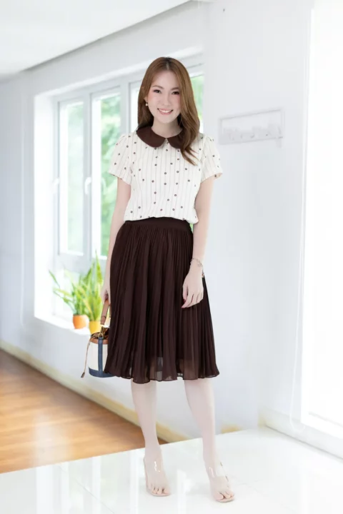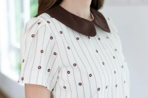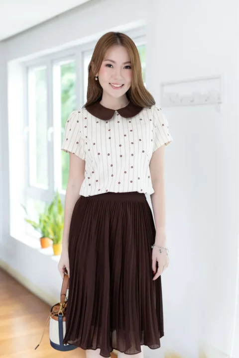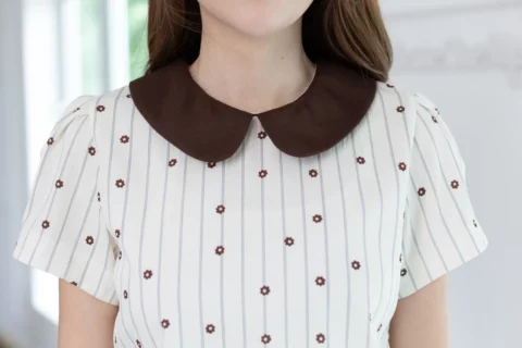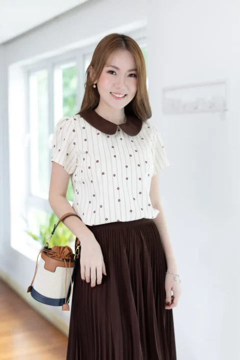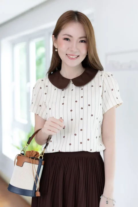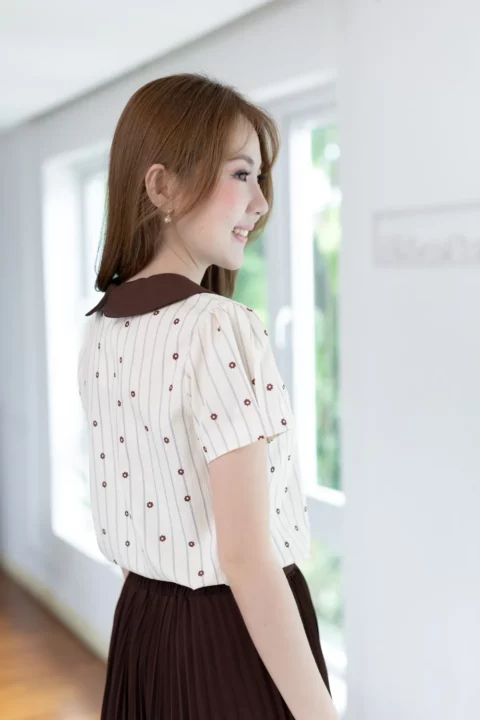 เสื้อที่ให้ลุคน่ารัก ปกบัวสีพื้น แขนสั้นจับจีบที่ปลายแขนดูพองนิดๆ ผ่าหยดน้ำหลังคอติดกระดุมสวมสะดวก ทรงเรียบร้อยดูดี ผ้าเนื้อย่น พิมพ์ลายริ้วสลับดอก ดู Retro นิดๆ ใส่ง่ายแมทช์ง่าย