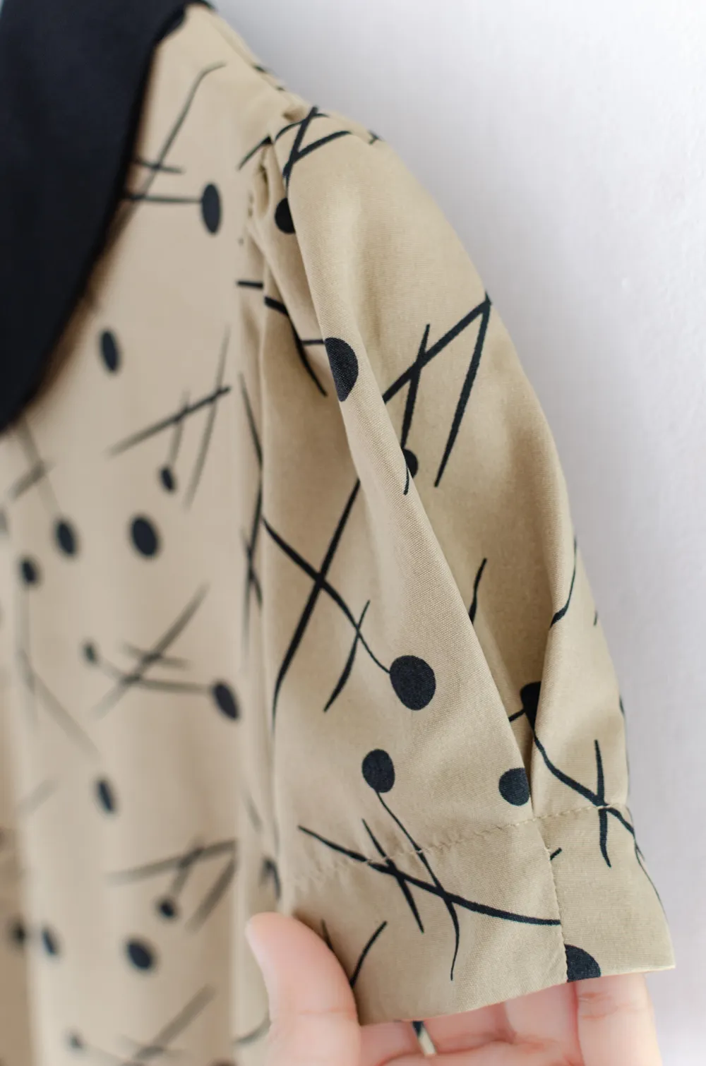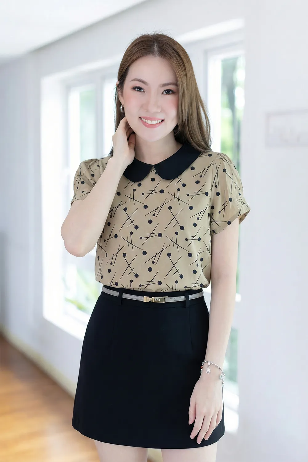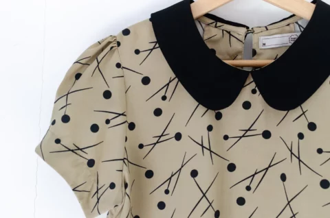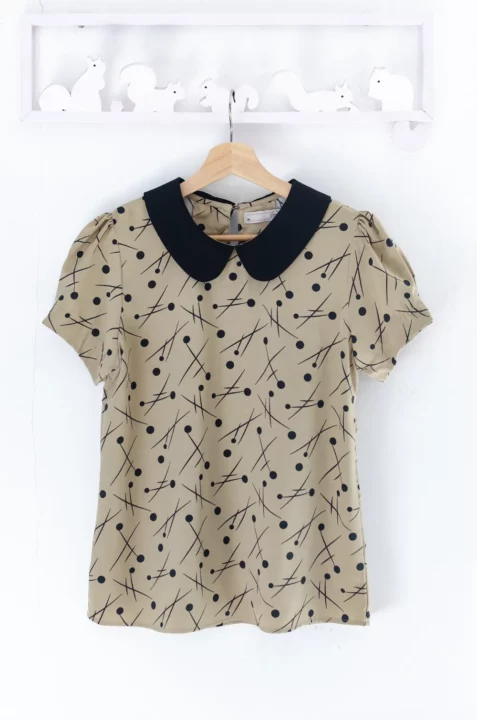 เสื้อที่ให้ลุคน่ารัก ปกบัวสีพื้น แขนสั้นจับจีบที่ปลายแขนดูพองนิดๆ ผ่าหยดน้ำหลังคอติดกระดุมสวมสะดวก ทรงเรียบร้อยดูดี ผ้าพิมพ์ลายกราฟิก ใส่ง่ายแมทช์ง่าย