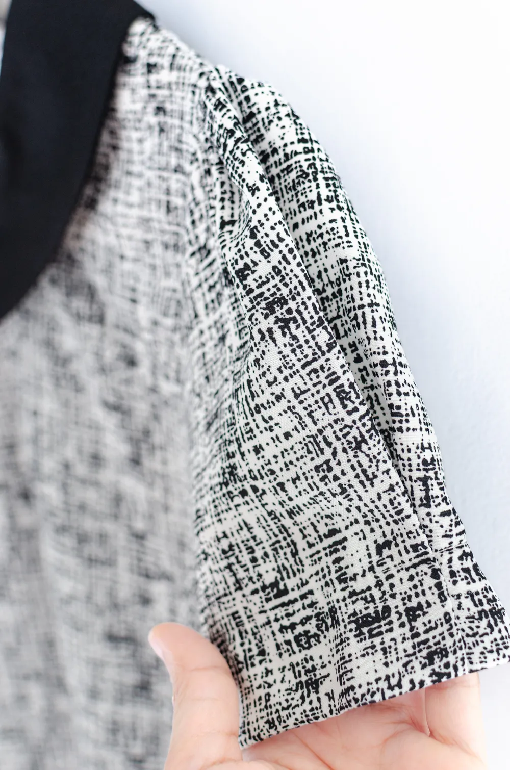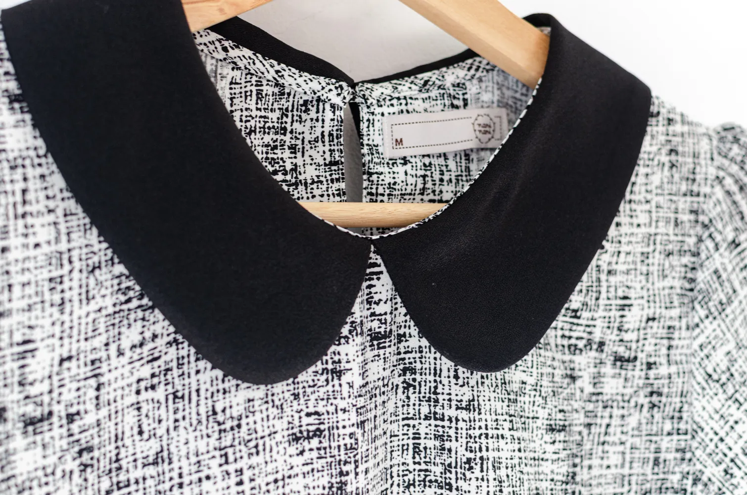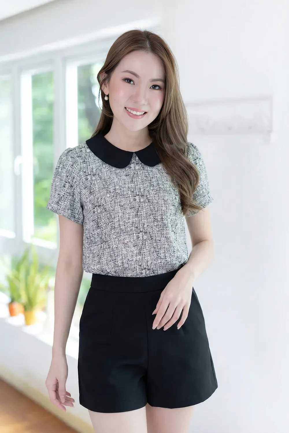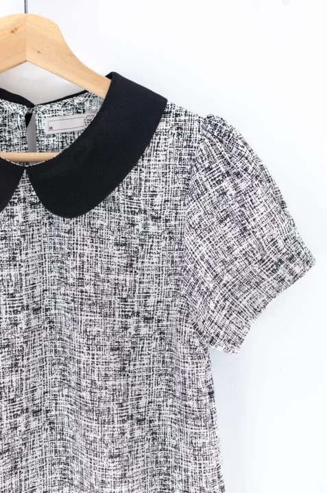 เสื้อที่ให้ลุคน่ารัก ปกบัวสีพื้น แขนสั้นจับจีบที่ปลายแขนดูพองนิดๆ ผ่าหยดน้ำหลังคอติดกระดุมสวมสะดวก ทรงเรียบร้อยดูดี ผ้าพิมพ์ลายกราฟิก ใส่ง่ายแมทช์ง่าย