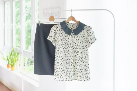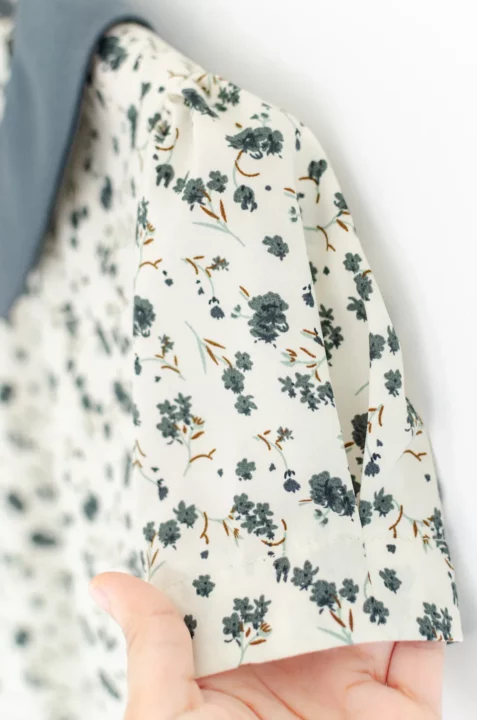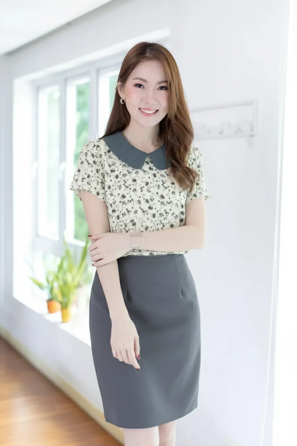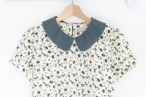 เสื้อที่ให้ลุคน่ารัก ปกบัวสีพื้น แขนสั้นจับจีบที่ปลายแขนดูพองนิดๆ ผ่าหยดน้ำหลังคอติดกระดุมสวมสะดวก ทรงเรียบร้อยดูดี ผ้าพิมพ์ลายดอกไม้ ใส่ง่ายแมทช์ง่าย
