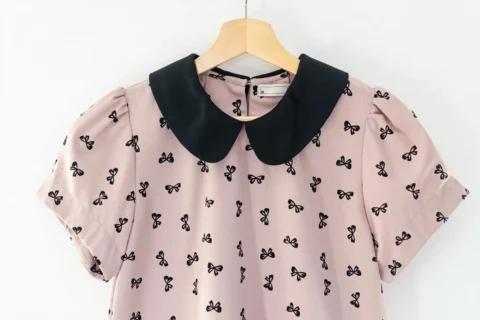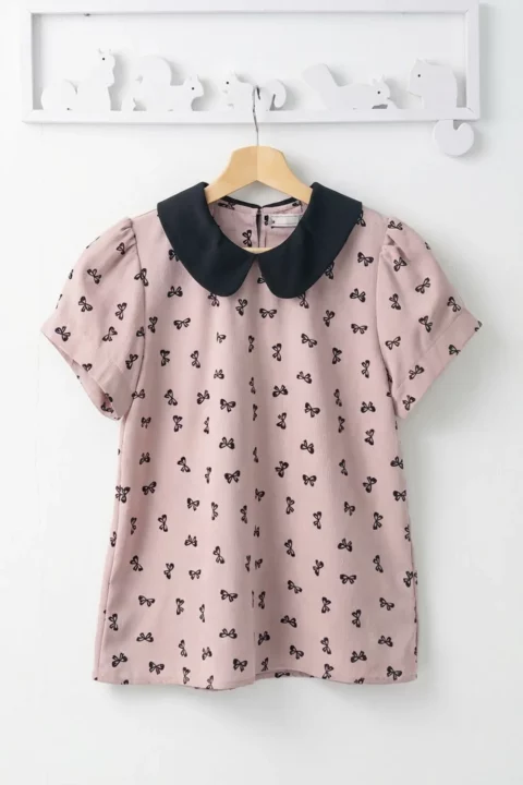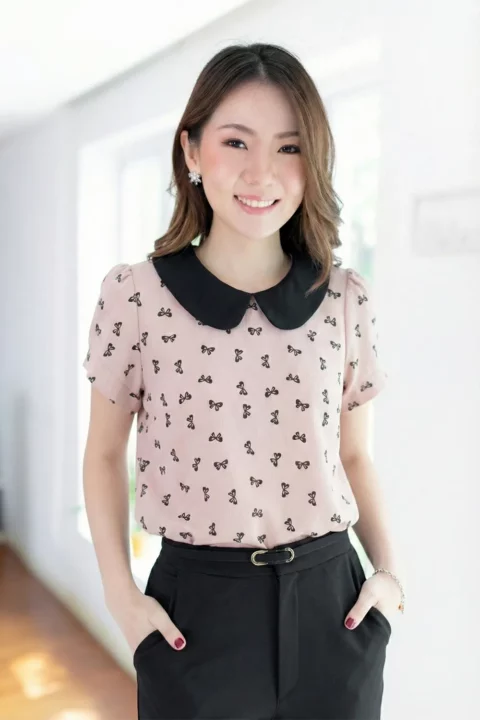 เสื้อที่ให้ลุคน่ารัก ปกบัวสีพื้น แขนสั้นจับจีบที่ปลายแขนดูพองนิดๆ ผ่าหยดน้ำหลังคอติดกระดุมสวมสะดวก ทรงเรียบร้อยดูดี ผ้าเนื้อย่นสีนัวๆที่ถูกต้อง พิมพ์ลายโบว์ ใส่ง่ายแมทช์ง่าย