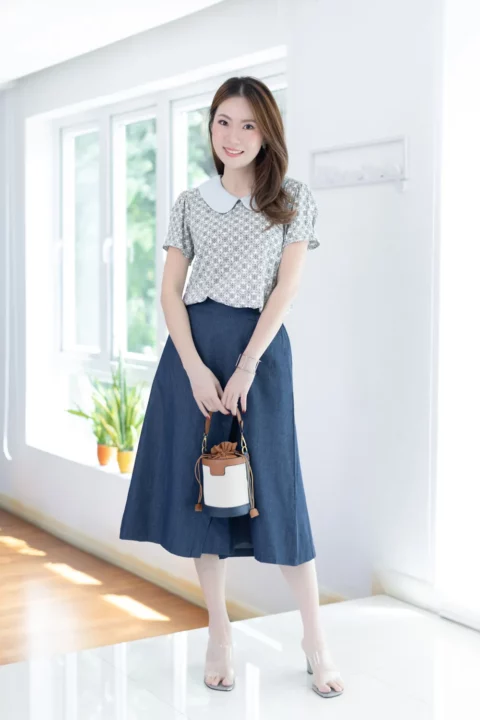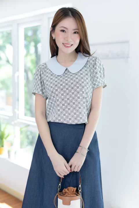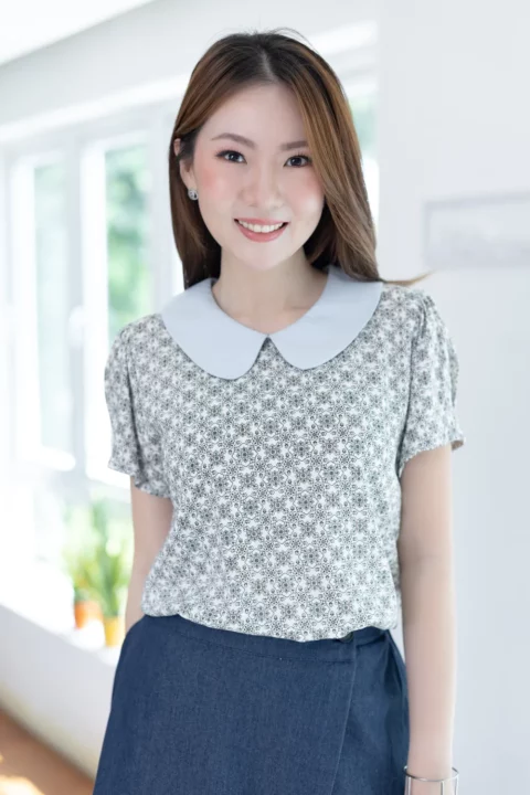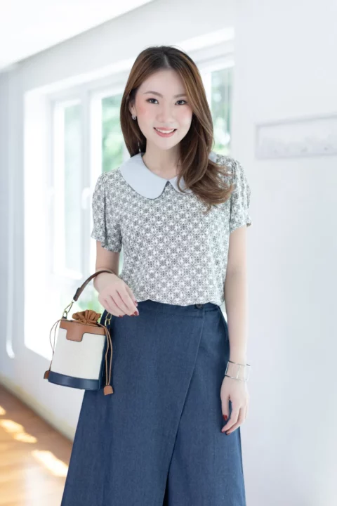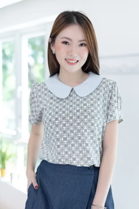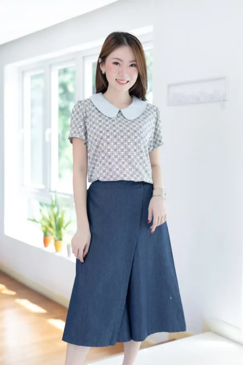 เสื้อที่ให้มู้ดธรรมชาติดูสบายๆ ปกบัวสีพื้น แขนสั้นจับจีบที่ปลายแขนดูพองนิดๆ ผ่าหยดน้ำหลังคอติดกระดุมสวมสะดวก ทรงเรียบร้อยดูดี ผ้าพิมพ์ลายกราฟิก ใส่ง่ายแมทช์ง่าย รุ่นนี้ผ้าจะเป็นฟีลนิ่มๆทิ้งๆไม่พอง หลังซักจะมีการหดตัวเข้ามาเนื่องจากวิธีการทอแบบเส้นใยไม่ได้ชิดกันมาก แต่จะคลายตัวกลับไปเมื่อรีดค่ะ ดังนั้นอาจจะไม่เหมาะกับคนที่ไม่ต้องการรีดผ้านะคะ ส่วนใครที่ชอบลายสลาฟ สายธรรมชาติ ไม่เนี้ยบมาก เลือกรุ่นนี้ไปเสริมลุคได้เลย ลายพิมพ์เก๋มากค่า