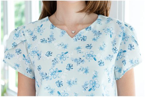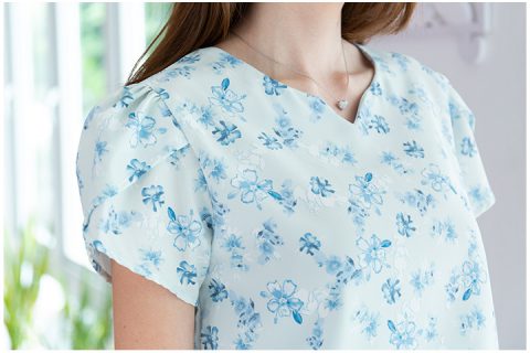 เสื้อทำงานน่ารักๆพิมพ์ลายดอกทั่วตัว คอกลมบากตัววีเล็กๆตรงกลาง ต่อแขนสั้นซ้อนกลีบดอกไม้ ผ่าหยดน้ำหลังติดกระดุมคอ ผ้าไหมอิตาลีเนื้อนิ่มเนียน สีฟ้าอ่อน สวยสบายตา