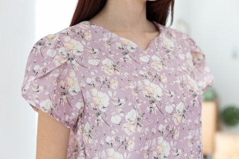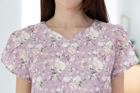 เสื้อทำงานลายอ่อนหวาน คอกลมบากตัววีเล็กๆตรงกลาง ต่อแขนสั้นซ้อนกลีบดอกไม้ ผ่าหยดน้ำหลังติดกระดุมคอ โฟร์เวย์พิมพ์ลายดอกไม้ เนื้อกำลังดีไม่หนา แต่ไม่โปร่งแสง แต่งตัวง่ายแน่นอน