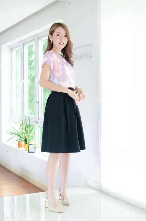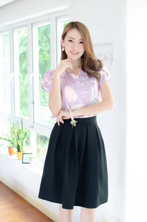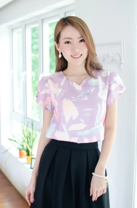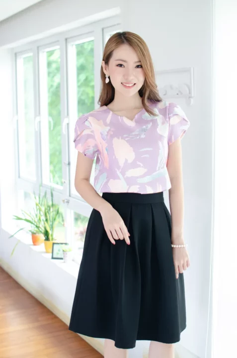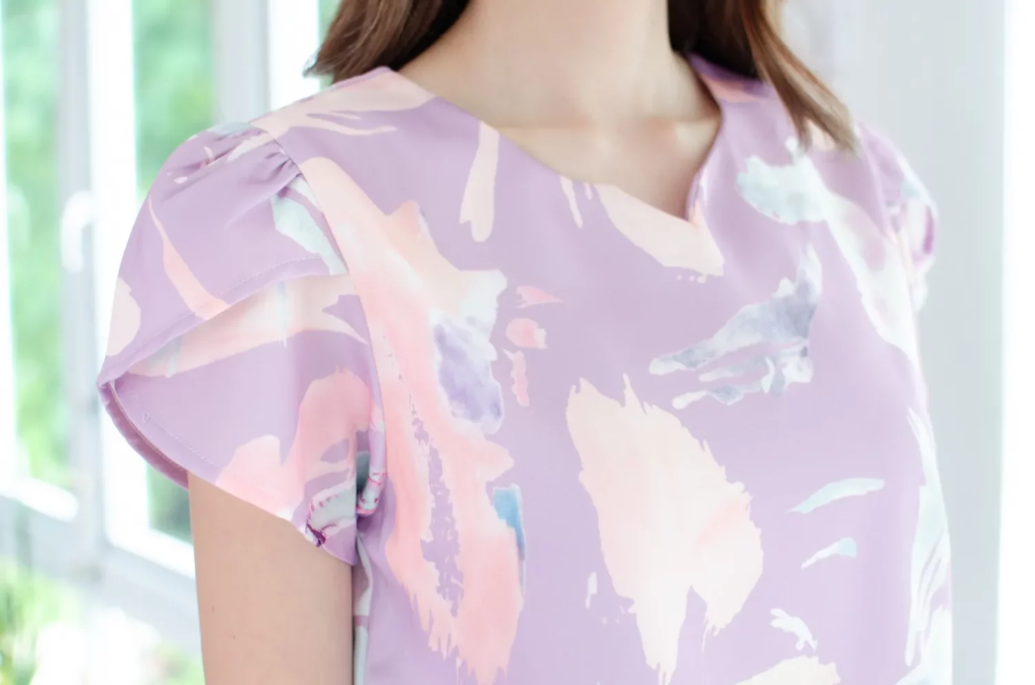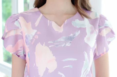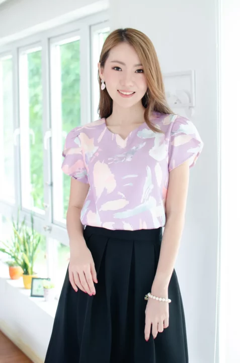 เสื้อทำงานน่ารักๆพิมพ์ลายกราฟิกสีหวาน คอกลมบากตัววีเล็กๆตรงกลาง ต่อแขนสั้นซ้อนกลีบดอกไม้ ผ่าหยดน้ำหลังติดกระดุมคอ ผ้าเนื้อดี ไม่บาง ทรงสวยคลาสสิกค่ะ