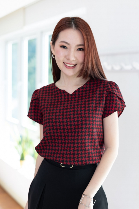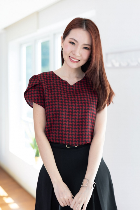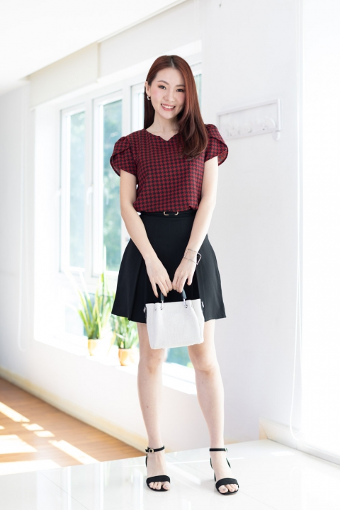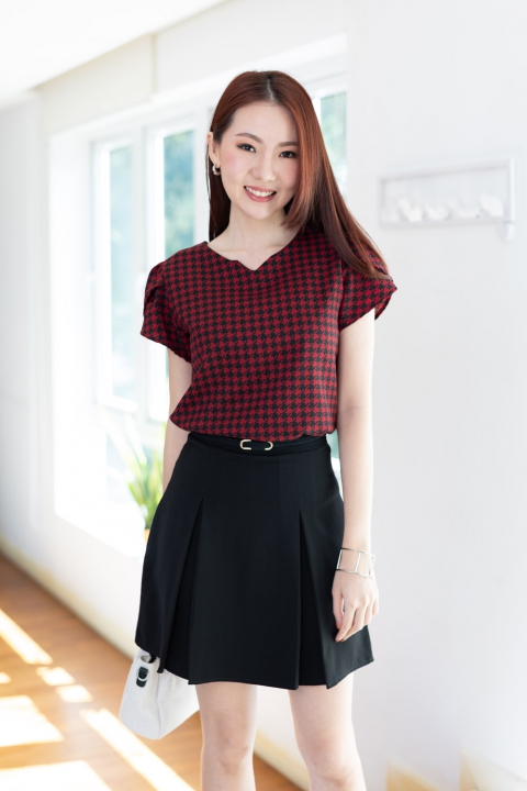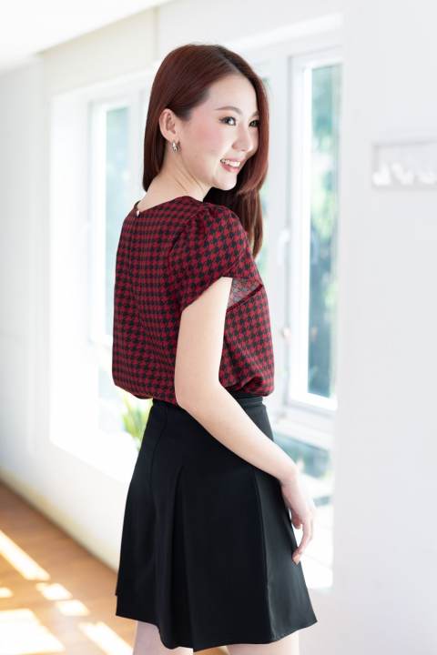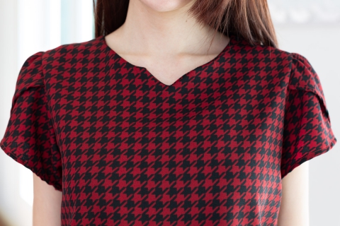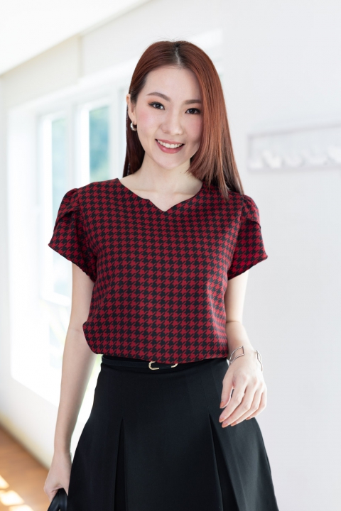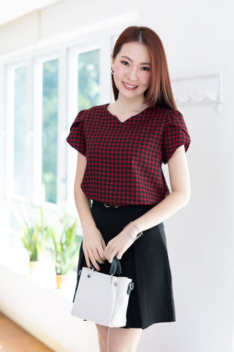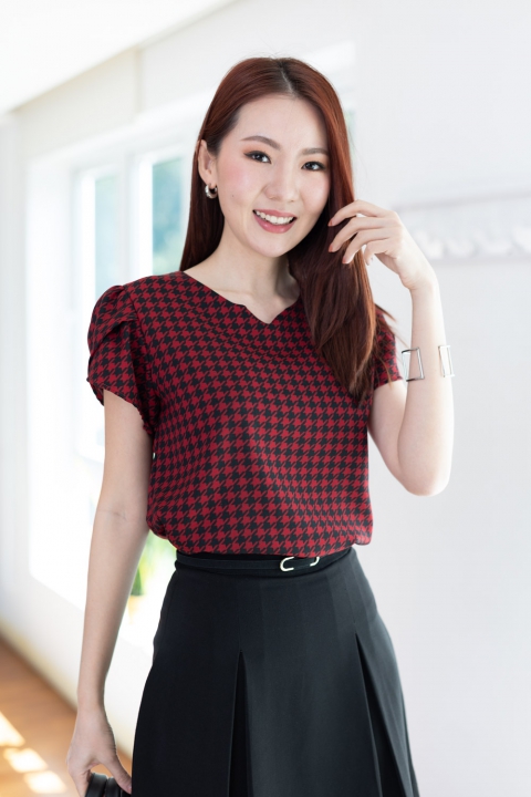 เสื้อทำงานลายเก๋ไก๋ คอกลมบากตัววีเล็กๆตรงกลาง ต่อแขนสั้นซ้อนกลีบดอกไม้ ผ่าหยดน้ำหลังติดกระดุมคอ โฟร์เวย์เนื้อนิ่ม แต่งตัวง่ายแน่นอนเพราะเนื้อไม่หนากำลังดี แต่ไม่โปร่งแสง ผ้าทอลายชิโนริ (Houndstooth) สวยแบบโดดเด่นเลย