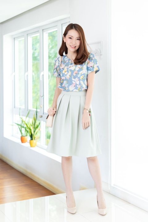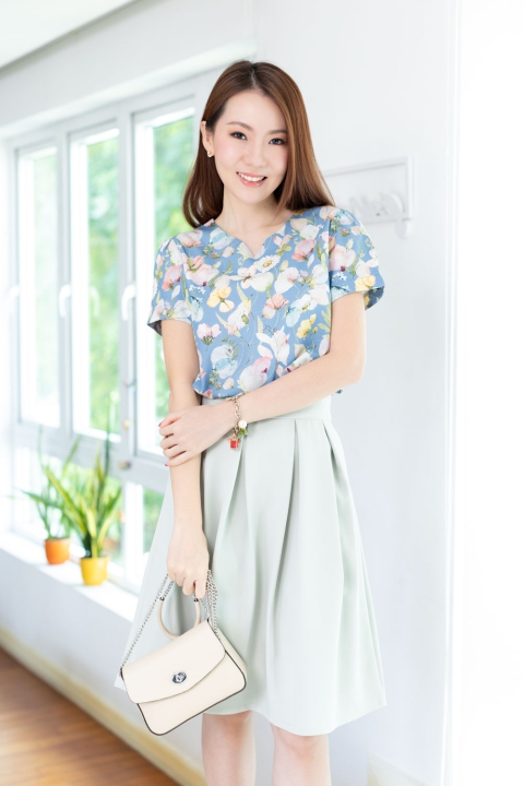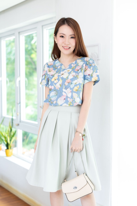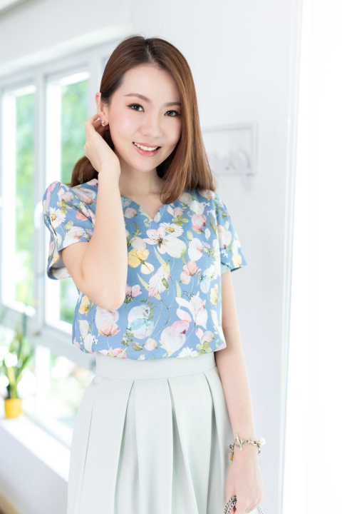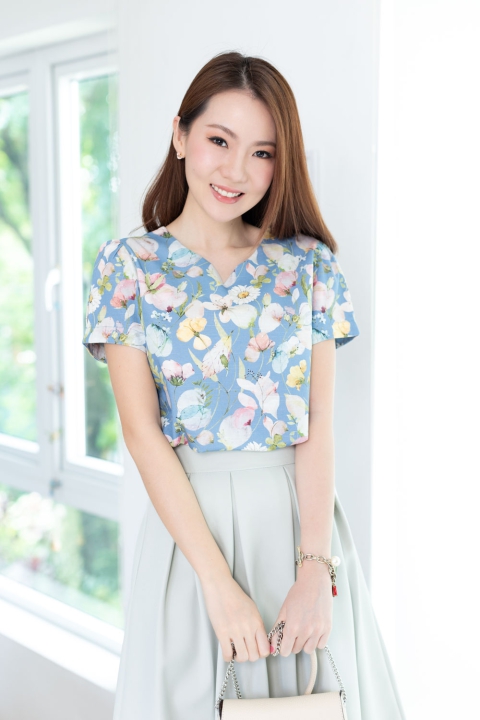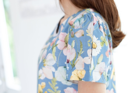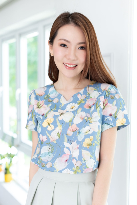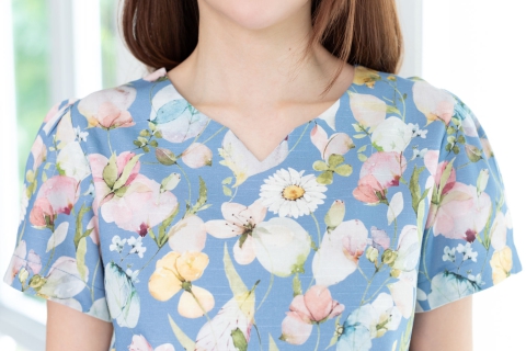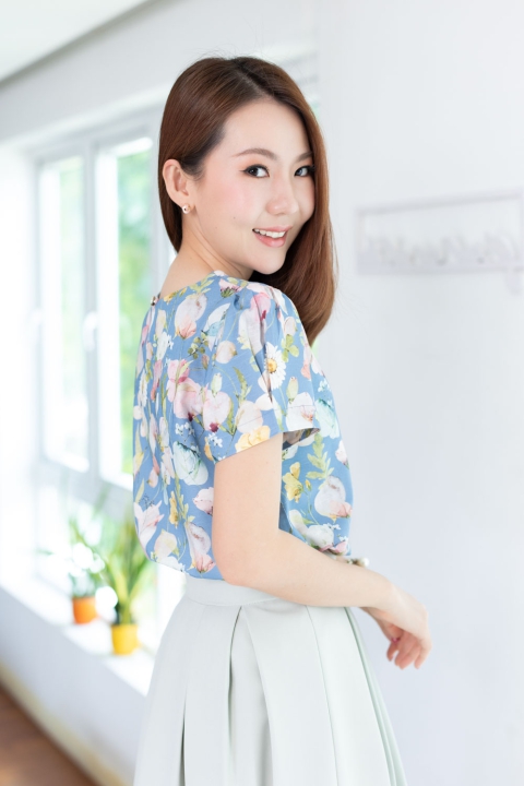 เสื้อลินินผสมทอลายสลาฟ ผ้านิ่มพิมพ์ลายดอกไม้ ทรงคอกลม บากตัววีเล็กๆตรงกลาง ต่อแขนสั้นจับจีบที่ปลายแขน ดูพองนิดๆ ผ่าหยดน้ำหลังติดกระดุม ทรงใส่ง่าย