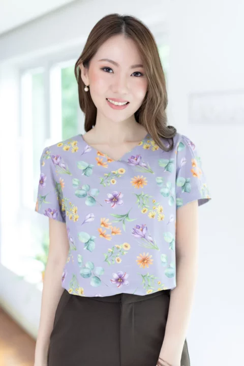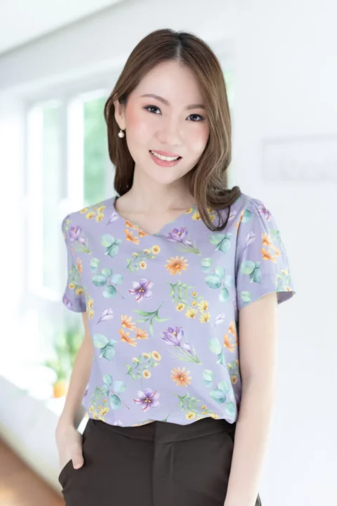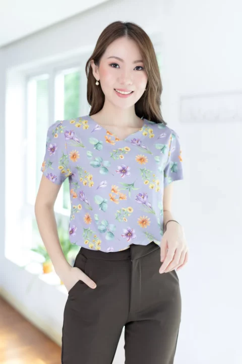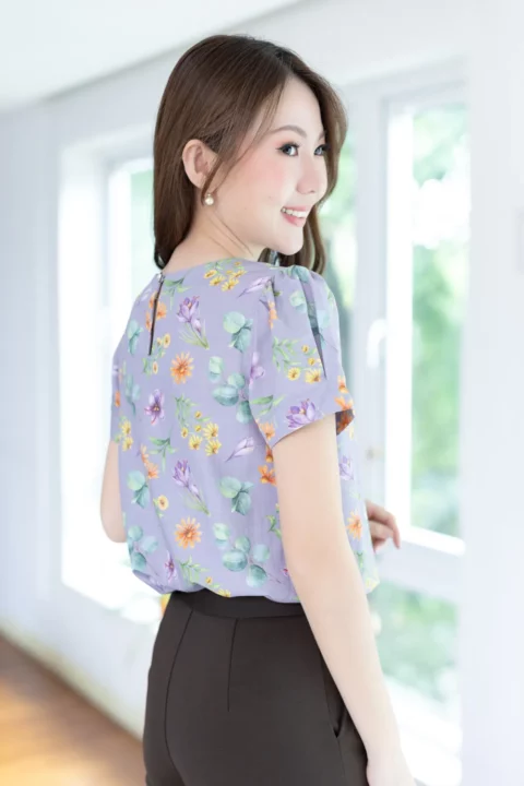 เสื้อลินินผสมทอลายสลาฟ ผ้านิ่ม พิมพ์ลายดอกไม้ ทรงคอกลม บากตัววีเล็กๆตรงกลาง ต่อแขนสั้นจับจีบที่ปลายแขน ดูพองนิดๆ ผ่าหยดน้ำหลังติดกระดุม ทรงใส่ง่าย