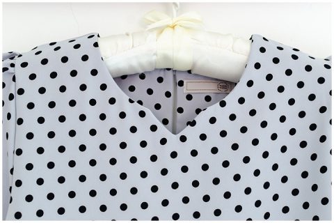 เสื้อทำงานมาแนวเก๋ๆ ลายจุด คอกลมบากตัววีเล็กๆตรงกลาง ต่อแขนสั้นจับจีบที่ปลายแขน ดูพองนิดๆ ผ่าหยดน้ำหลังติดกระดุม ทรงใส่ง่าย ผ้าเนื้อดี ไม่บางค่า