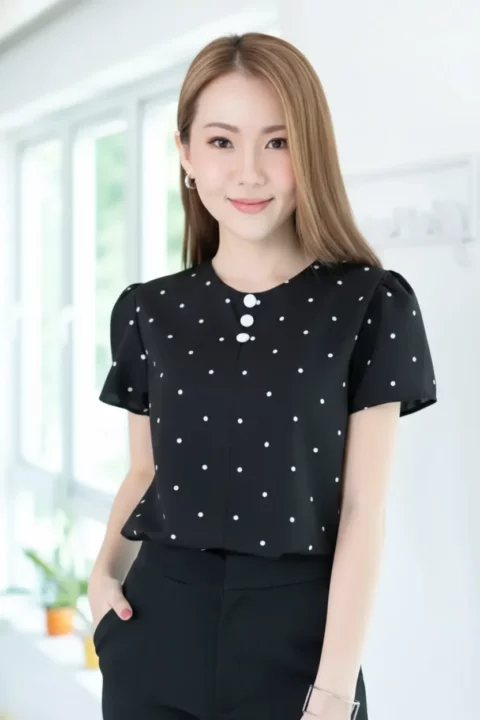 Size 38 – รอบอก 38”, คอกว้าง 6.5”, ไหล่ 14”, แขนยาว 7”, รอบวงแขน 18”, รอบปลายแขน 14”, ยาว 23”, รอบชายเสื้อ 42”