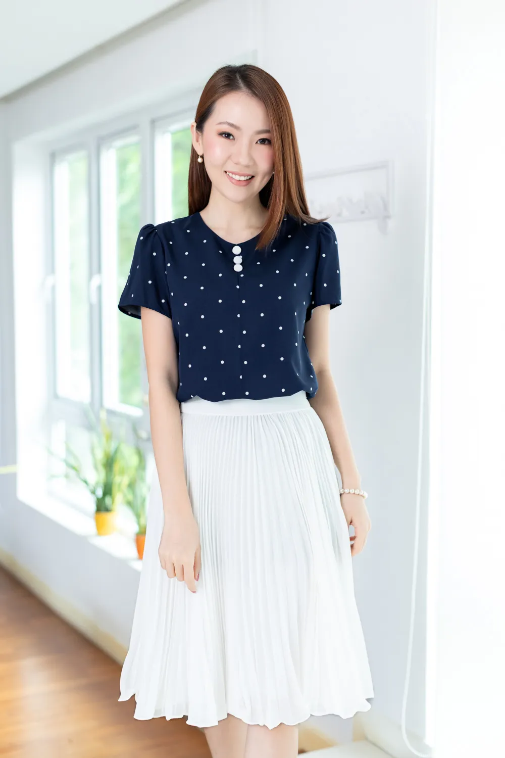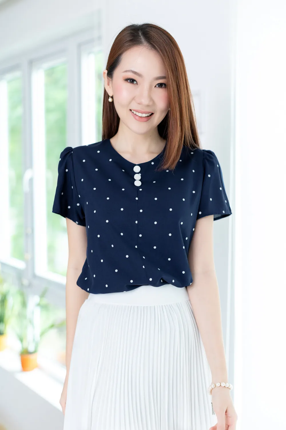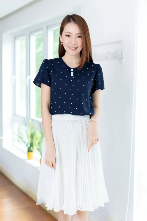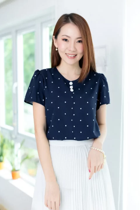 เสื้อทำงานคอกลม แต่งคัตติ้งตะเข็บตรงกลางด้านหน้า เติมกระดุมหลอกเรียงแถวด้านหน้า 3 เม็ด รุ่นนี้เป็นกระดุมปั๊มสวยเด่นเลยค่ะ ทรงแมทช์ง่าย ผ้าเนื้อดีใส่สบาย ยับยากรีดง่าย รับประกันความสวยหวาน งานคุณภาพค่ะ