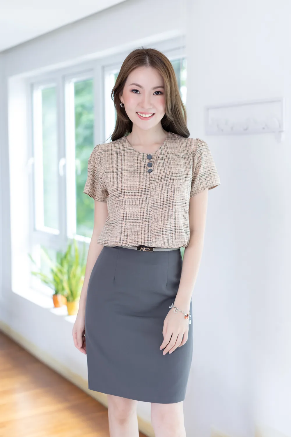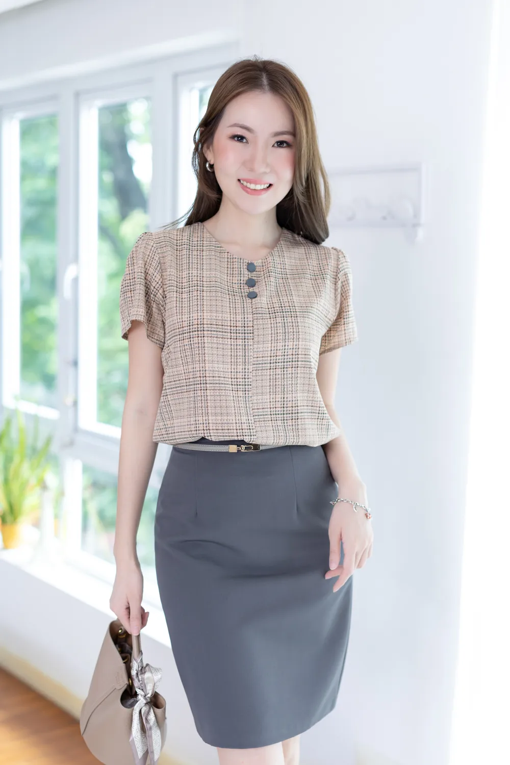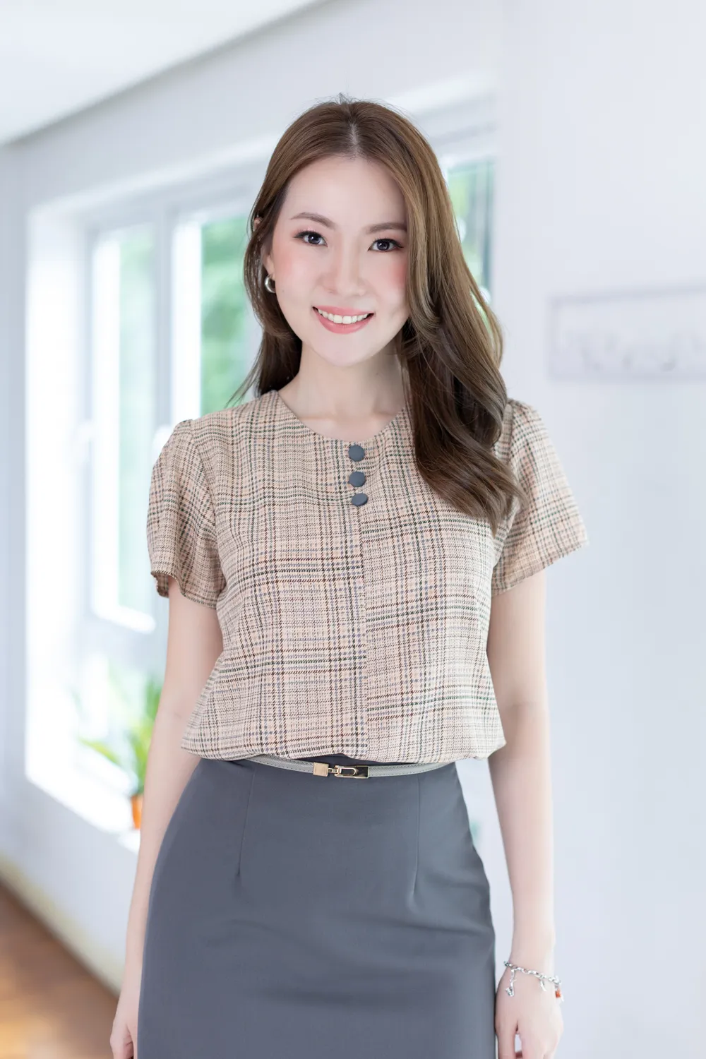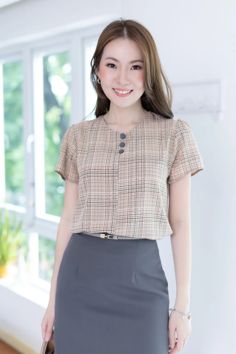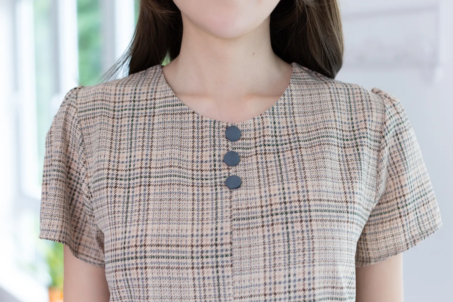 MT0301 Triple Button Plaid Blouse – Latte