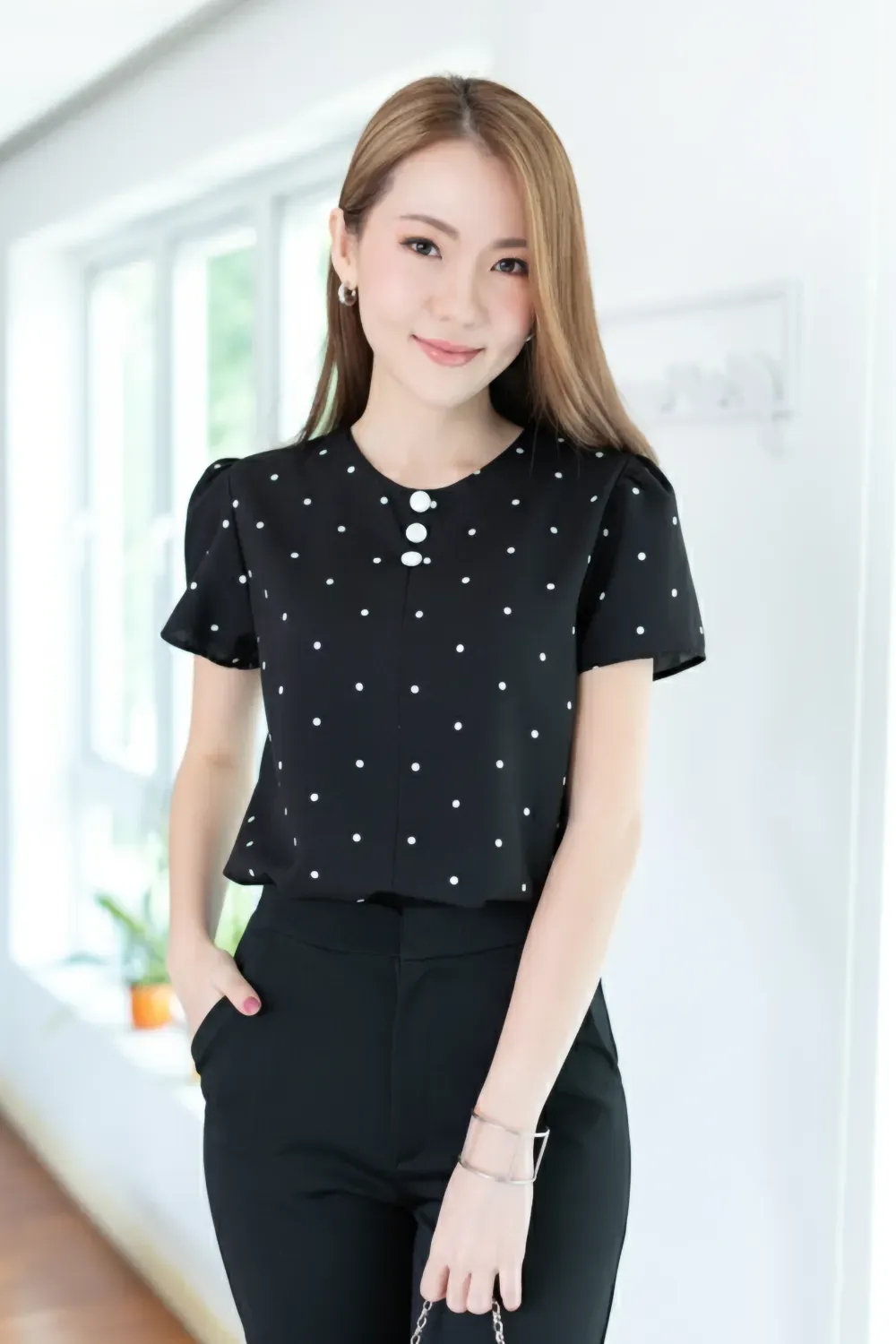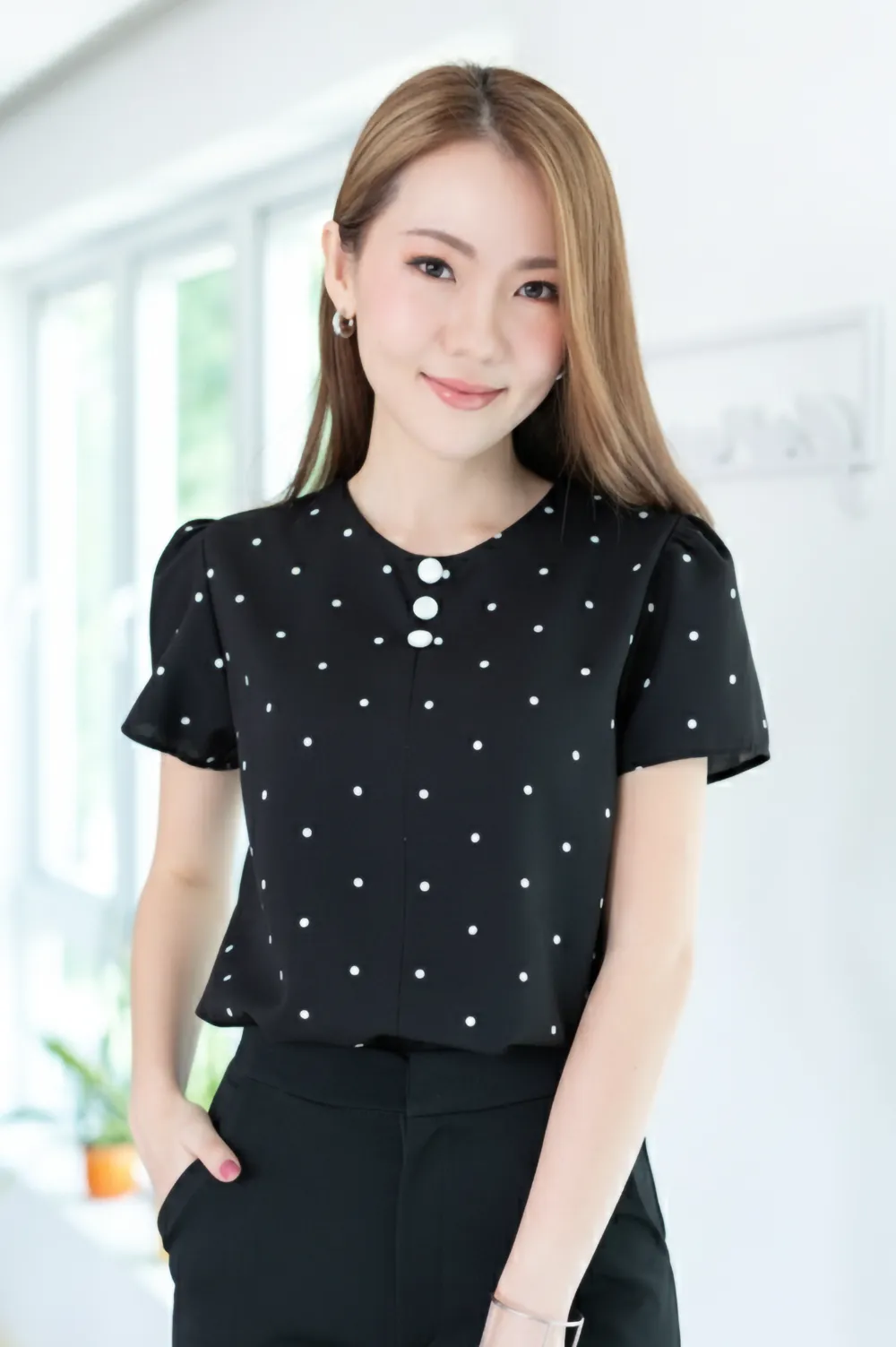 เสื้อทำงานคอกลม แต่งคัตติ้งตะเข็บตรงกลางด้านหน้า เติมกระดุมหลอกเรียงแถวด้านหน้า 3 เม็ด สวยเด่นเลยค่ะ ทรงแมทช์ง่าย ผ้าเนื้อดีใส่สบาย ยับยากรีดง่าย รับประกันความสวยหวาน งานคุณภาพค่ะ
