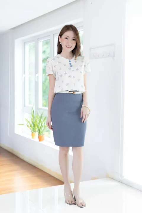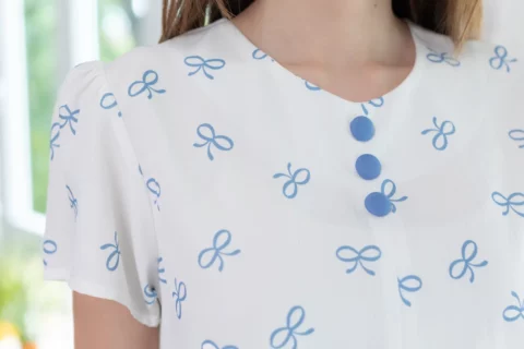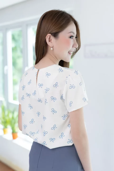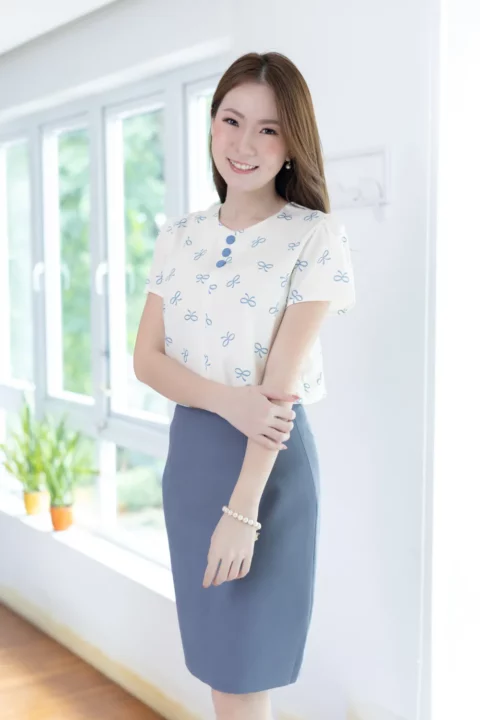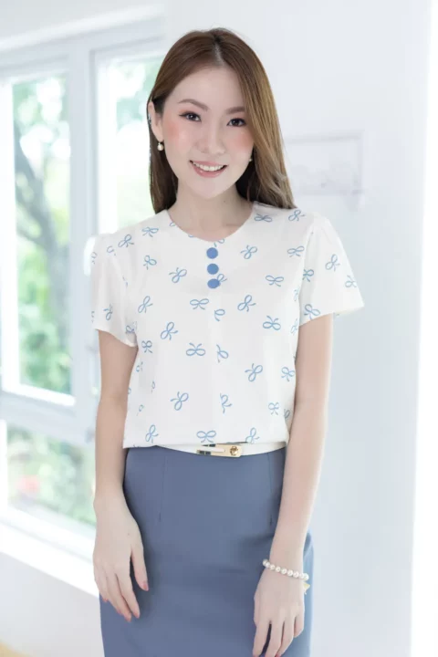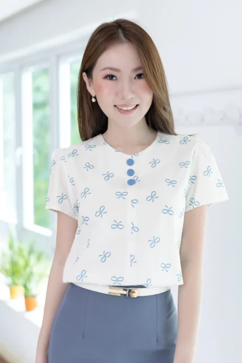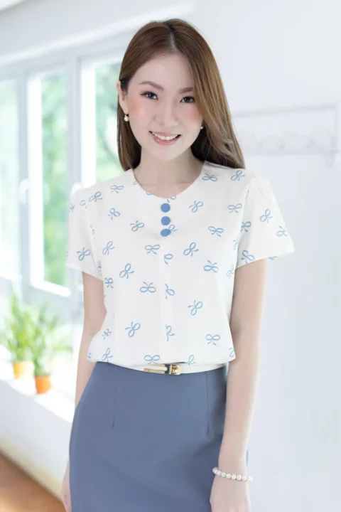 เสื้อทำงานคอกลม แต่งคัตติ้งตะเข็บตรงกลางด้านหน้า เติมกระดุมหลอกเรียงแถวด้านหน้า 3 เม็ด สวยเด่นเลยค่ะ ใช้ผ้าอัดย่นๆพิมพ์ลายโบว์ ทรงแมทช์ง่าย รับประกันความสวยหวาน งานคุณภาพค่ะ
