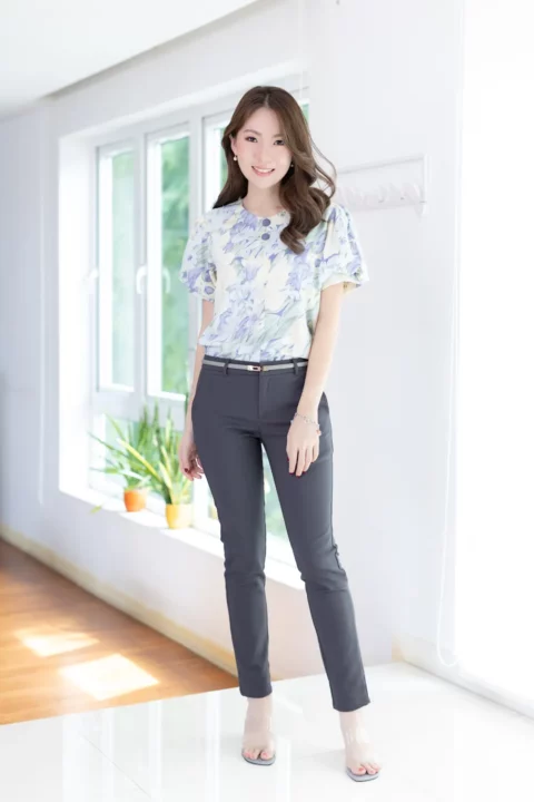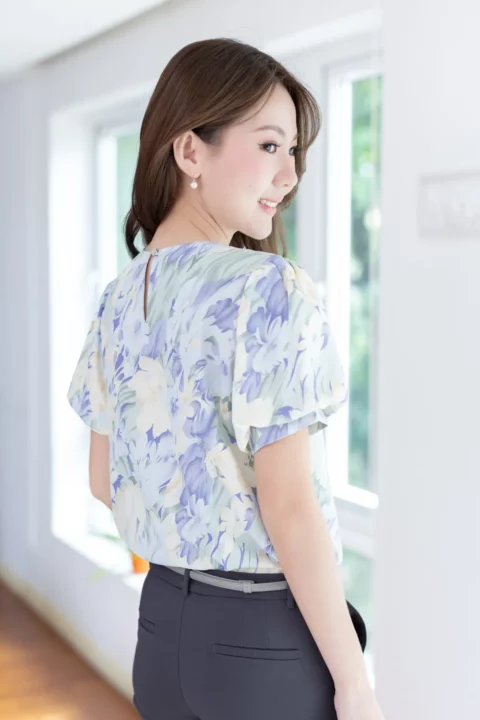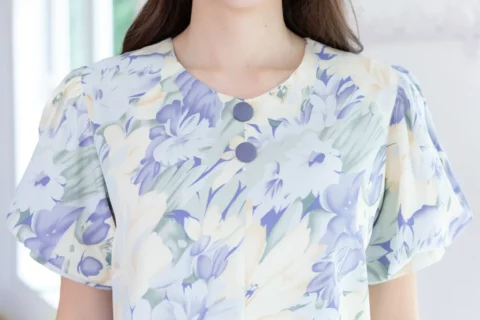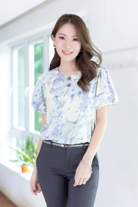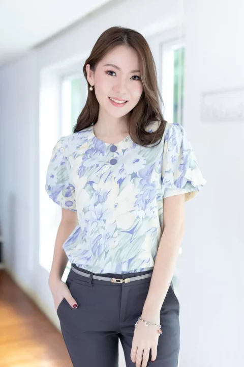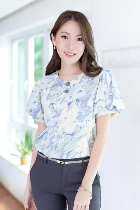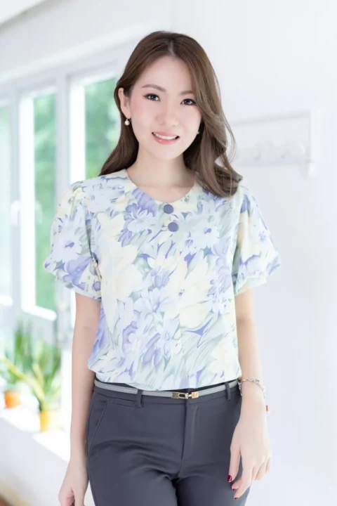 เสื้อคอกลมใส่ง่าย แต่งคัตติ้งตะเข็บตรงกลางด้านหน้า เติมกระดุมหลอกเรียงแถวด้านหน้า 2 เม็ด ดูน่ารัก ผ้าพิมพ์ลายดอกไม้ ต่อแขนทรงบอลลูนพองกำลังสวย ด้านหลังเจาะหยดน้ำติดกระดุม งานดีงามค่า