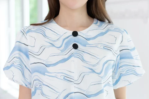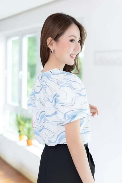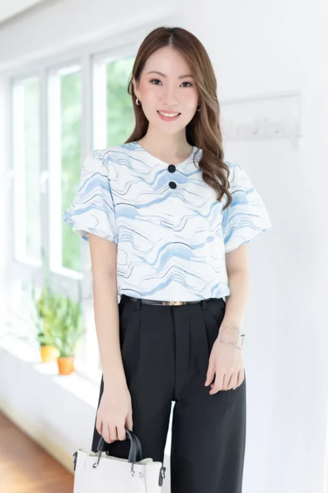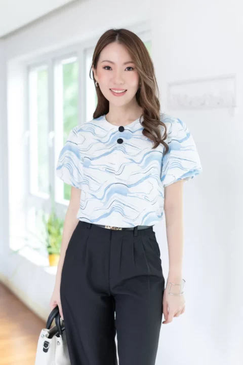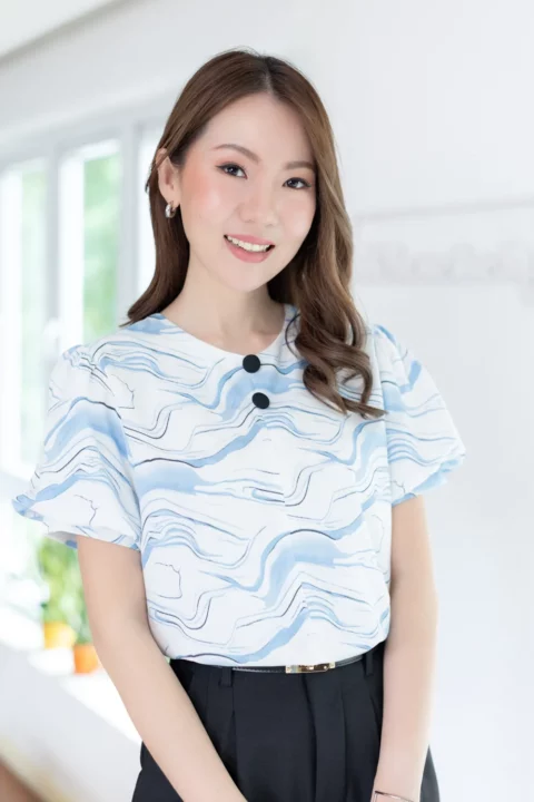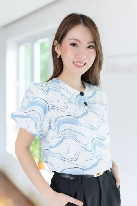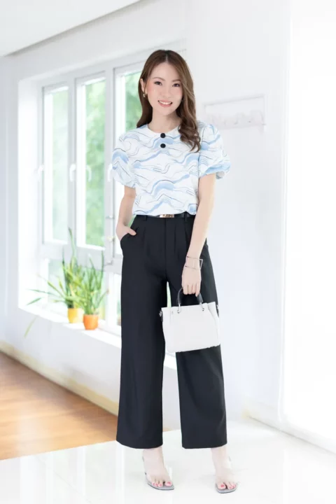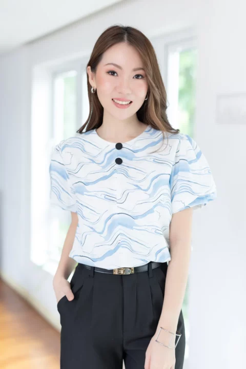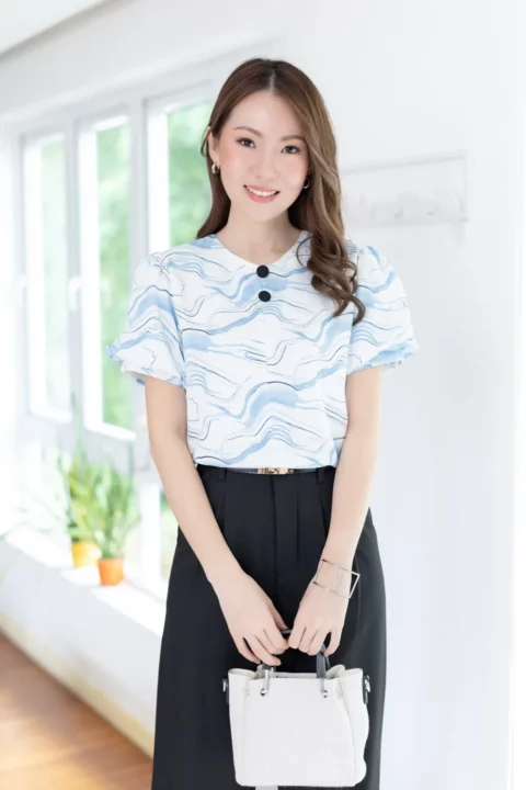 Color : ขาวลายกราฟิกฟ้า แต่งกระดุมดำ