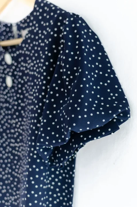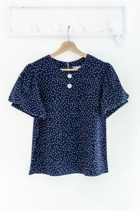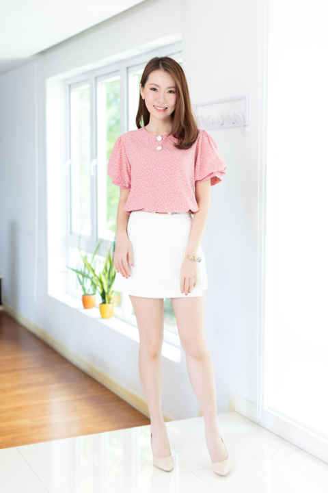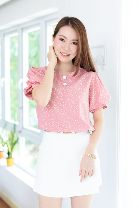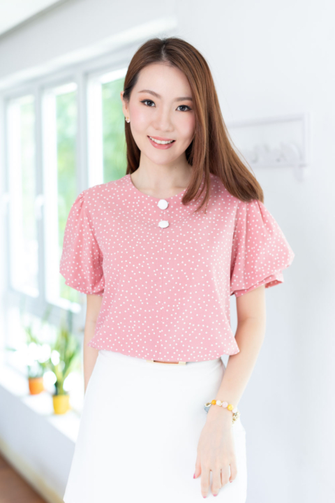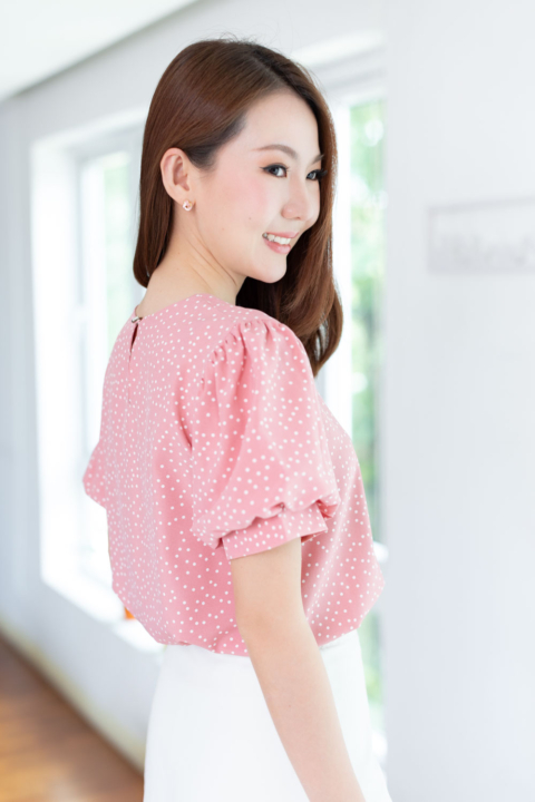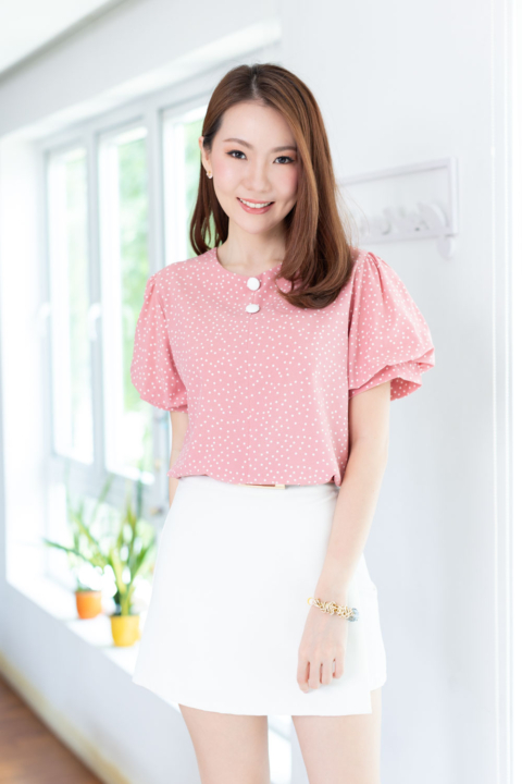 เสื้อคอกลมใส่ง่าย แต่งคัตติ้งตะเข็บตรงกลางด้านหน้า เติมกระดุมหลอกเรียงแถวด้านหน้า 2 เม็ด ดูน่ารัก ต่อแขนทรงบอลลูนพองกำลังสวย ด้านหลังเจาะหยดน้ำติดกระดุม งานดีงามค่า