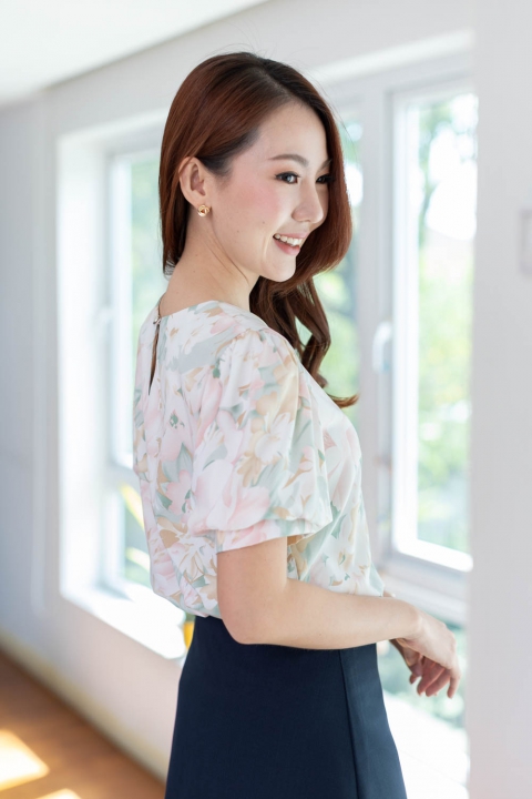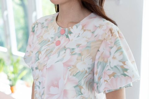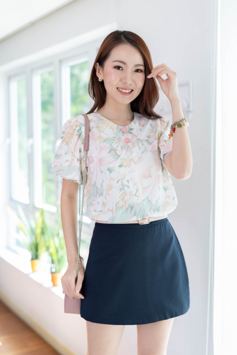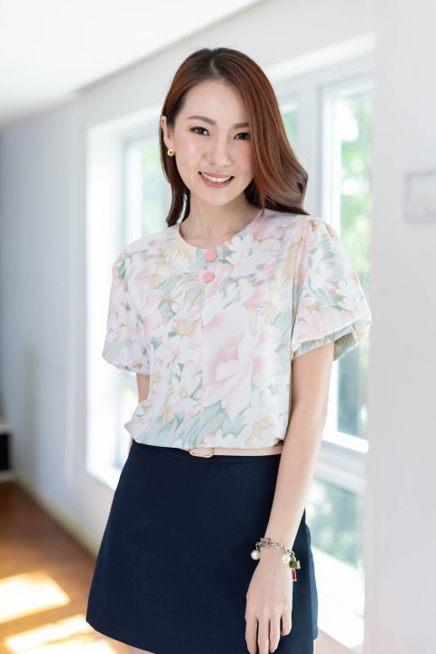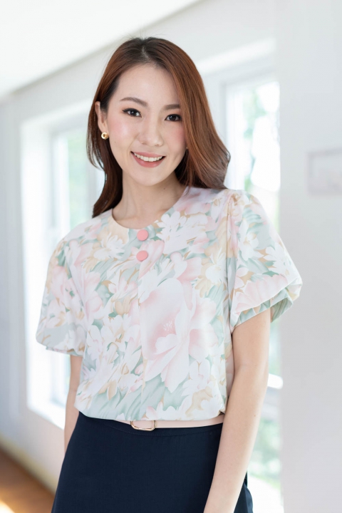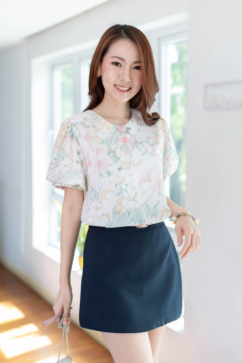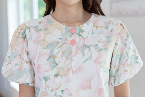 เสื้อคอกลมใส่ง่าย แต่งคัตติ้งตะเข็บตรงกลางด้านหน้า เติมกระดุมหลอกเรียงแถวด้านหน้า 2 เม็ด ดูน่ารัก ผ้าพิมพ์ลายดอกไม้ ต่อแขนทรงบอลลูนพองกำลังสวย ด้านหลังเจาะหยดน้ำติดกระดุม งานดีงามค่า